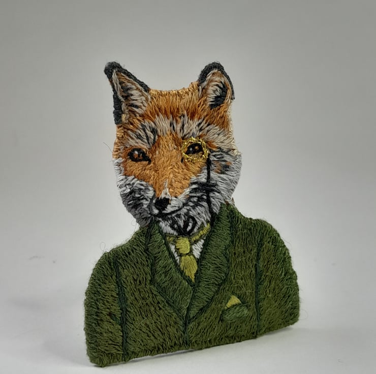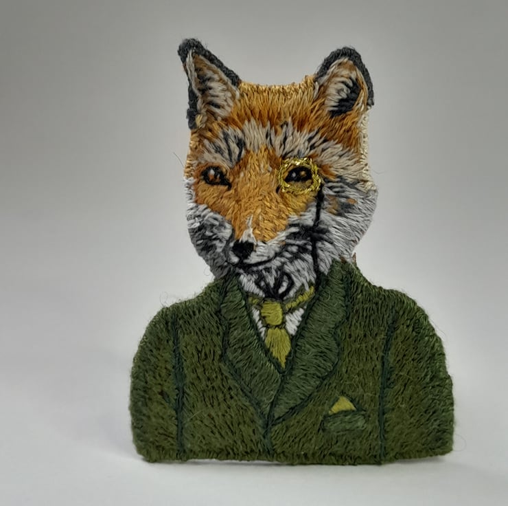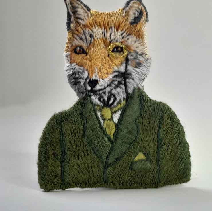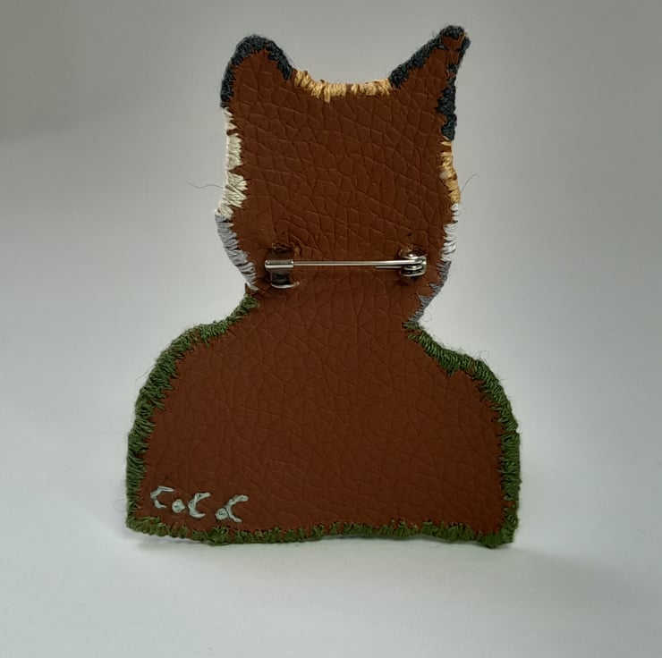 He has been delicately hand embroidered with DMC embroidery thread on to acrylic wool and finished with a brown faux leather backing and stainless steel clasp.