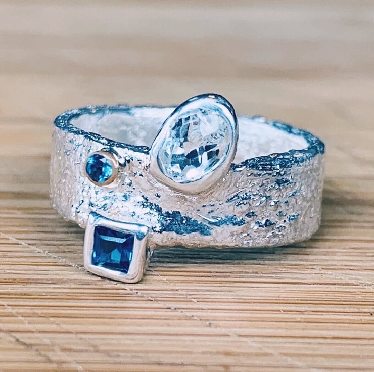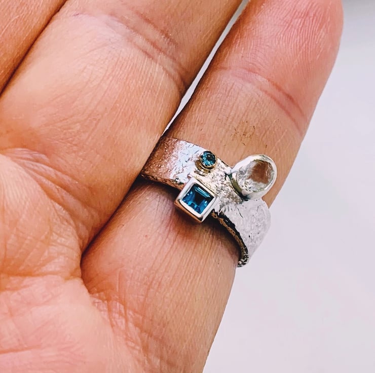 A reticulated textured handmade Silver band with a gold setting is a unique and artisanal piece of jewellery. Crafted using intense heat from the jewellers torch, which involves controlled heating and cooling of the metal to create a distinct, organic texture on the surface. This results a one-of-a-kind ring with irregular patterns and handcrafted feel. The use of silver and gold and a trinity of gemstones, featuring: off set oval white topaz, square London blue topaz and a little London blue topaz gives this ring a luxurious touch to the piece, making it a beautiful and valuable accessory.