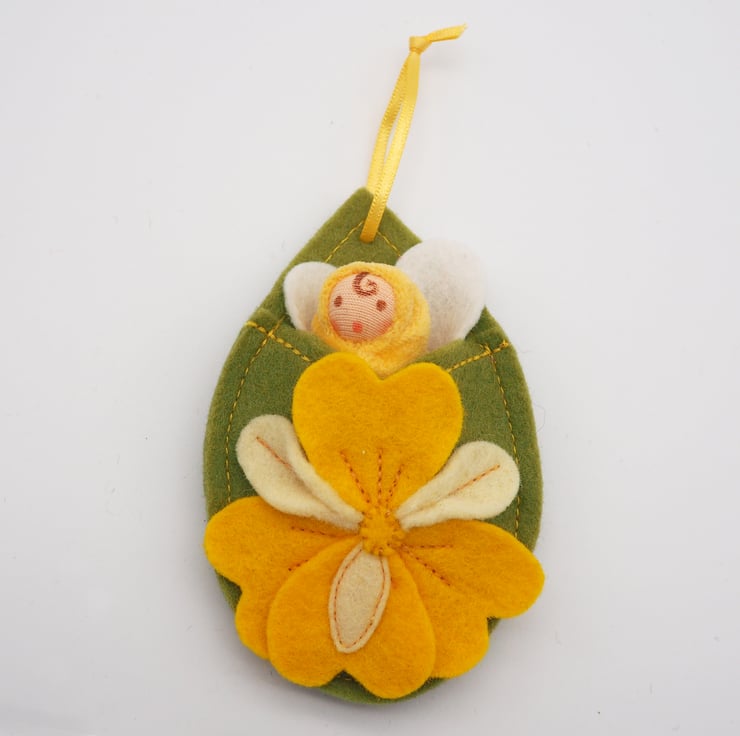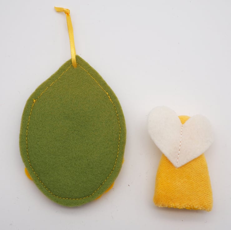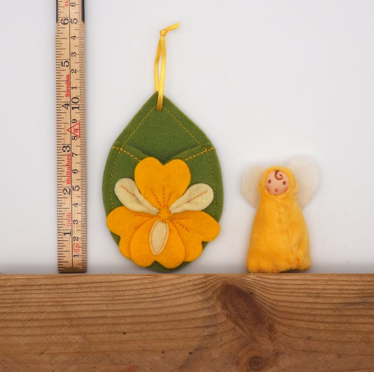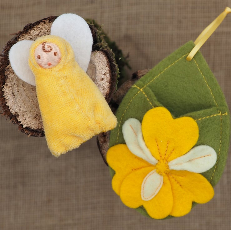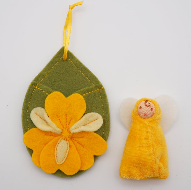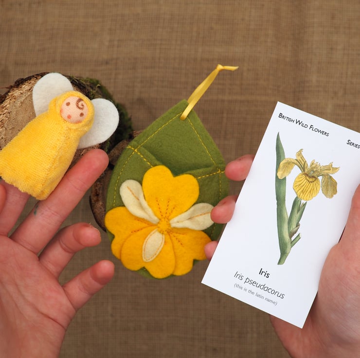 Iris is a flower fairy finger puppet with a yellow body and heart shaped wings. She sleeps in a leaf shaped green pod, with a handmade Iris flower appliquéd on the front.