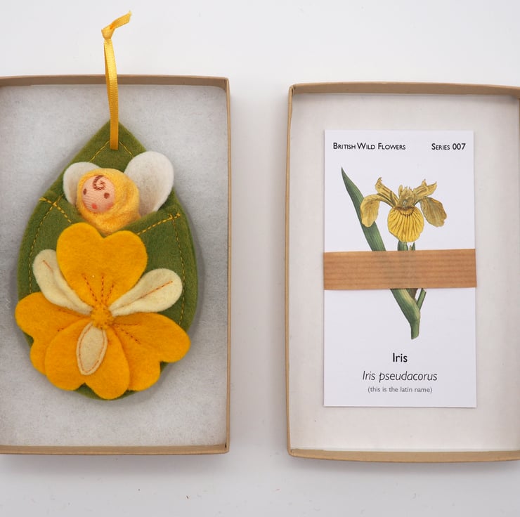 When you order your Iris doll you can chose from six skin tones and in addition whether to add a hanging loop to the leaf pod. She will arrive with you in a beautiful presentation box made using recycled materials. Did you know the native Iris flower in the UK is actually yellow but if you would rather I made your doll in purple with a purple flower just get in touch.