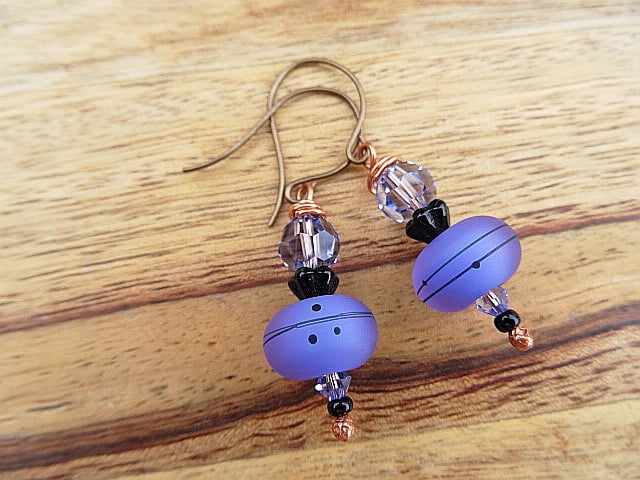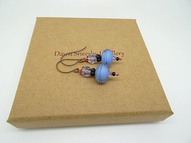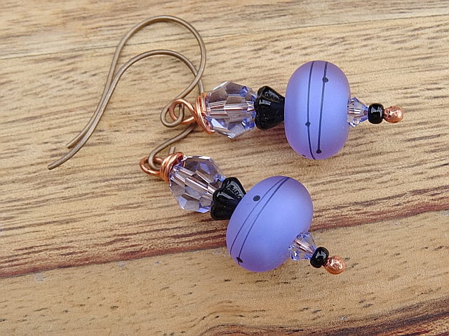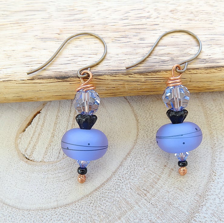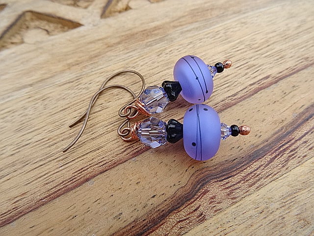 These are just lovely. I have made them using handmade lamp work glass rondels handmade by Trudi Doherty. They are a lovely frosted lavender, lilac colour with a black sphere like pattern, they measure 8 x 14mm. To these I have wired 8mm faceted crystal beads in the palest lavender shade, capped with Czech glass black bead caps. The earrings measure 2 inches (5cm) from top of vintaj brass, nickel free, round loop ear wires.