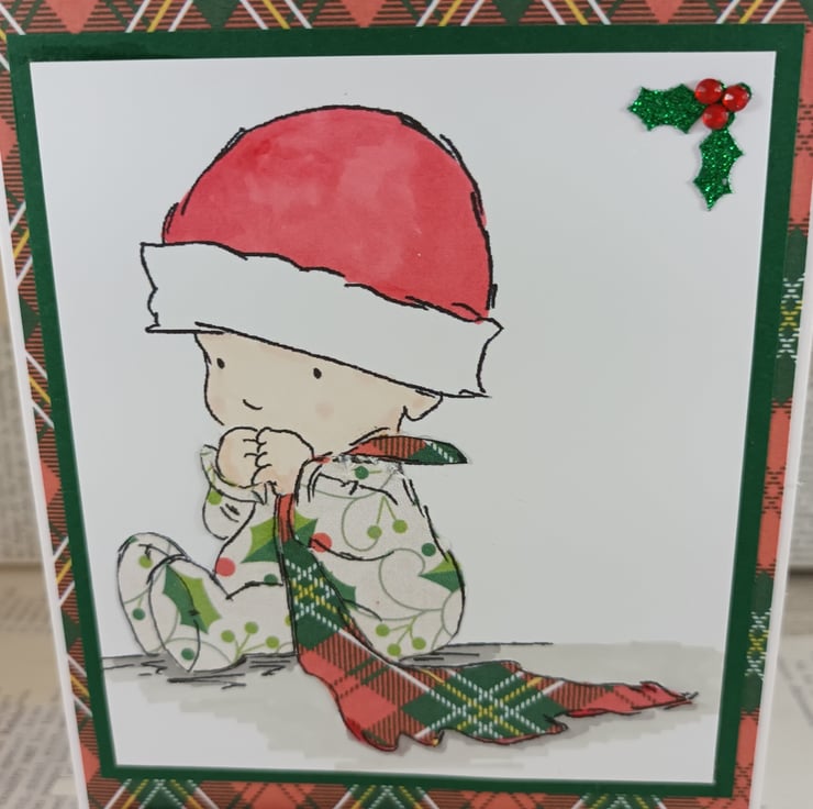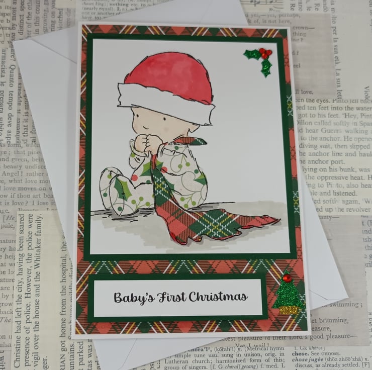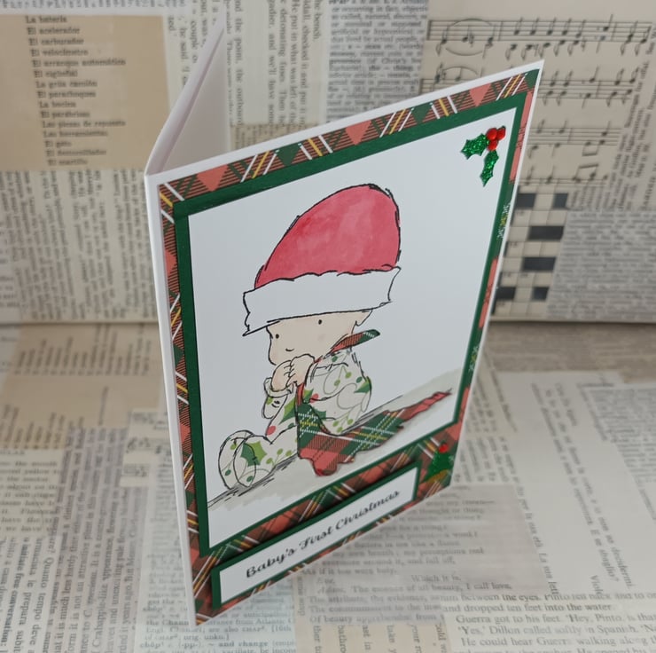 A6 Christmas card to send wishes to a baby on his/her first Christmas. The image is of a baby sitting clutching a blanket. Both the baby's outfit and the blanket have been paper pieced with Christmas themed/coloured papers. The image is framed with dark green card, embellished with a little glittered holly leaf and mounted onto tartan background paper. The sentiment reads: 'Baby's First Christmas' and has a small glittered tree alongside.