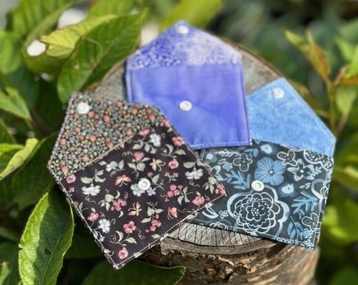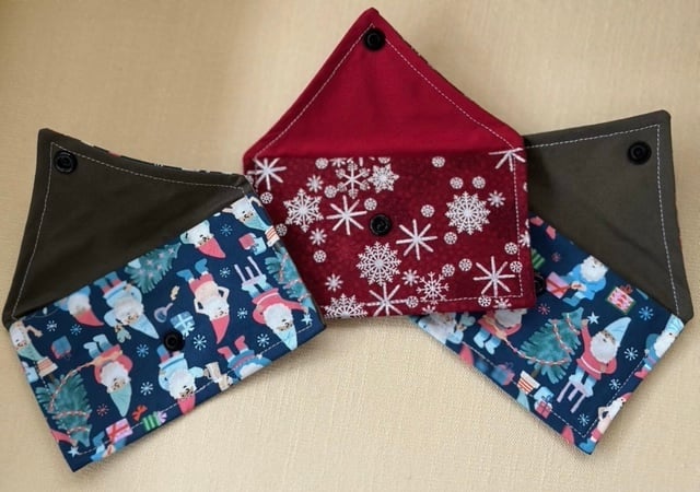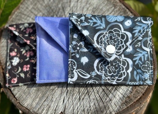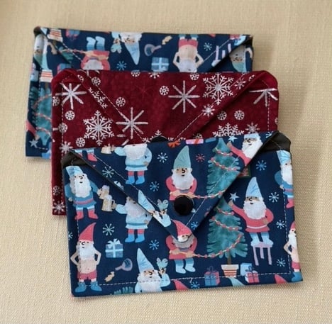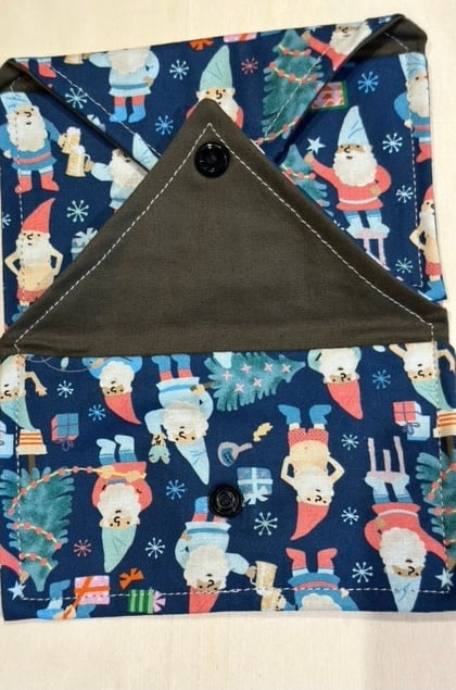 These pretty fabric gift envelopes measure 11cm x 9.5 cm approx. Ideal for small gifts like jewellery and lipsticks. Christmas envelopes are 14cm x 8.5 cm. They are also reusable. Each envelope is lined with a complementary lining, and has a snap fastener. Something different which adds to the presentation of a gift. A choice of blue flowers with leafy lining, black flowers and butterflies with a small flowery lining, blue with spotty blue lining, silver stars with red lining, blue elves. Please specify flowers, black, blue, blue elves, red stars when ordering.