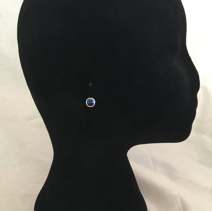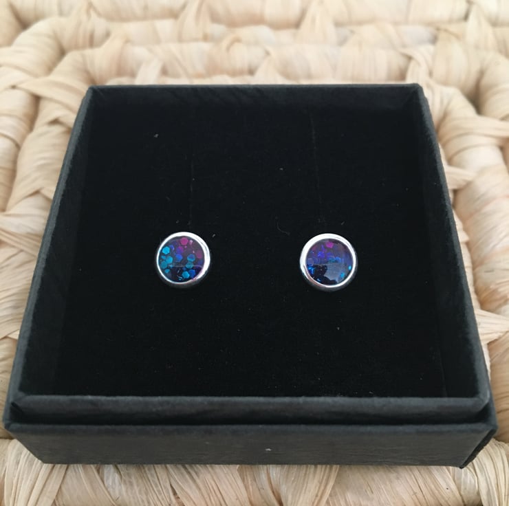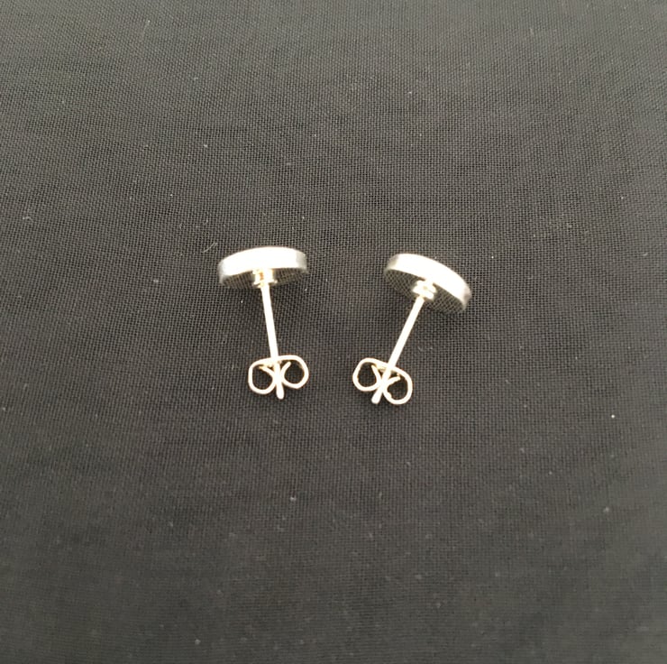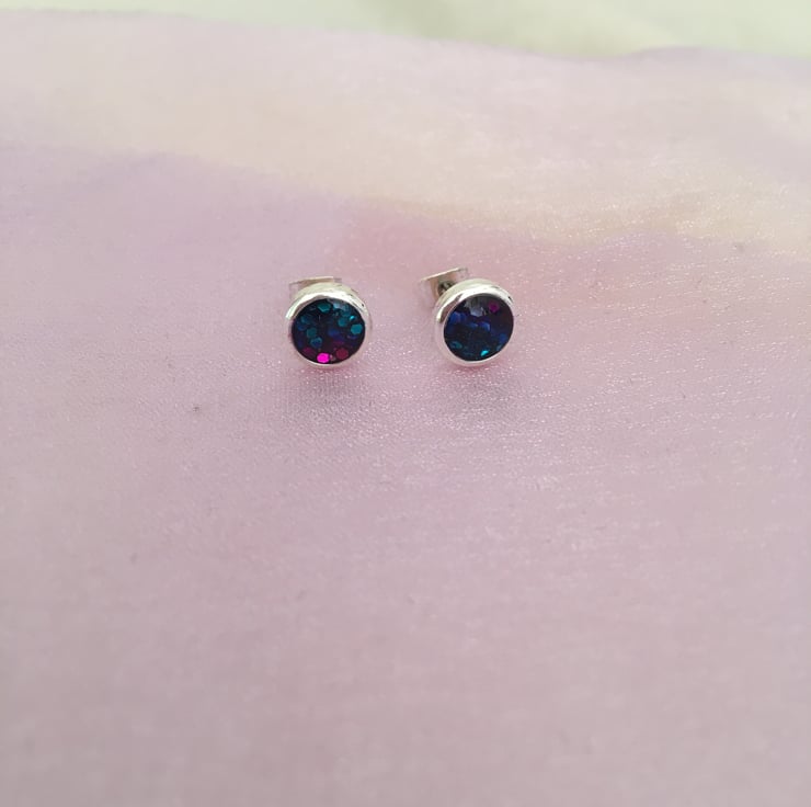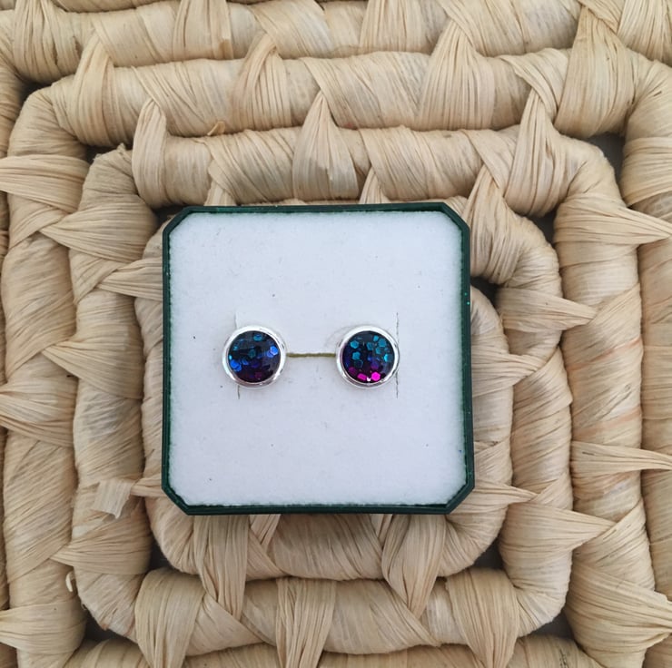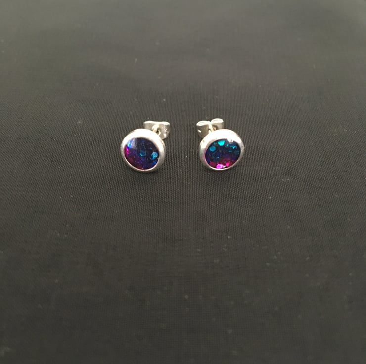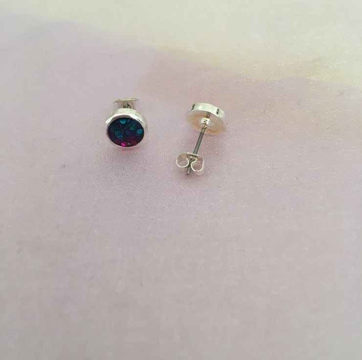 These are sweet handcrafted tri-coloured centred stud earrings in a quality silver plated setting.