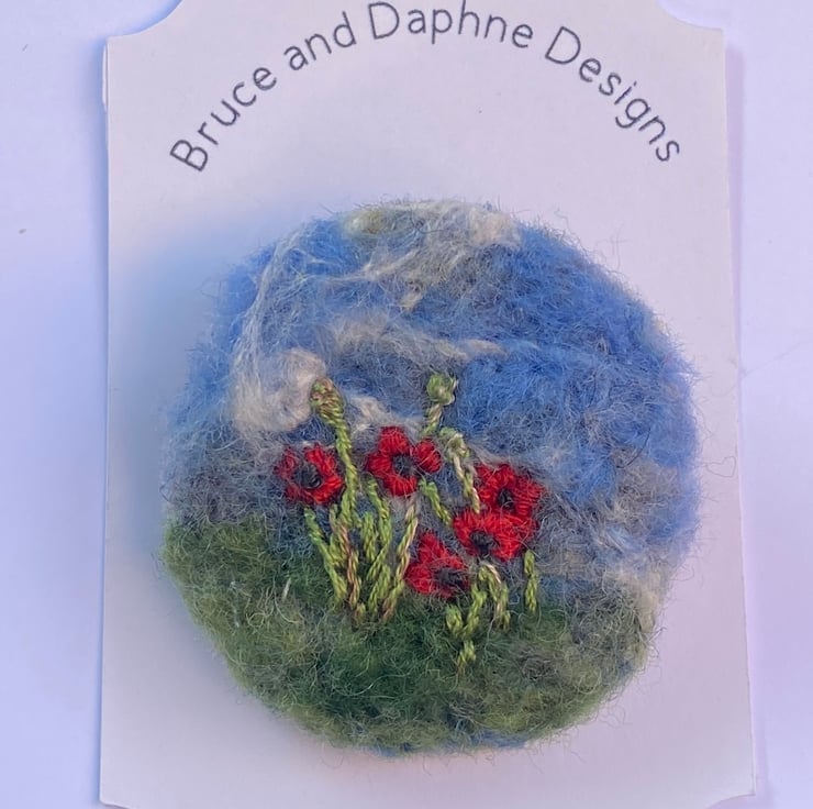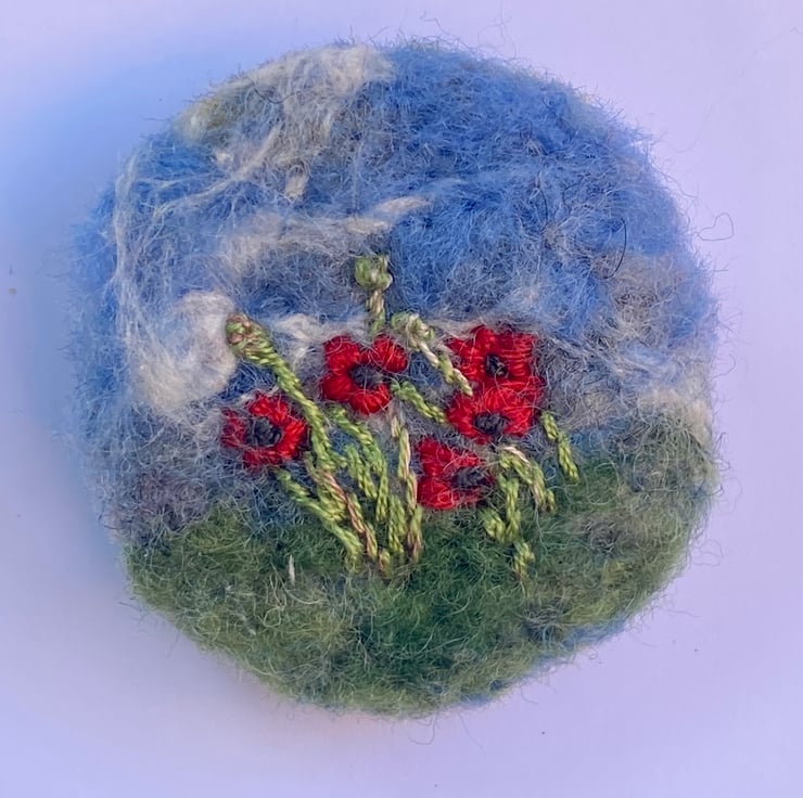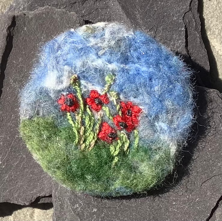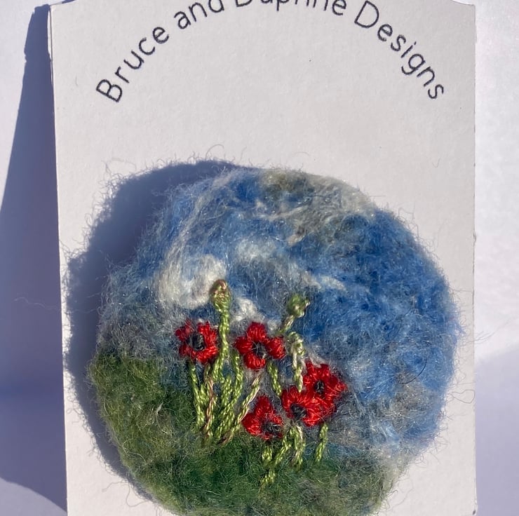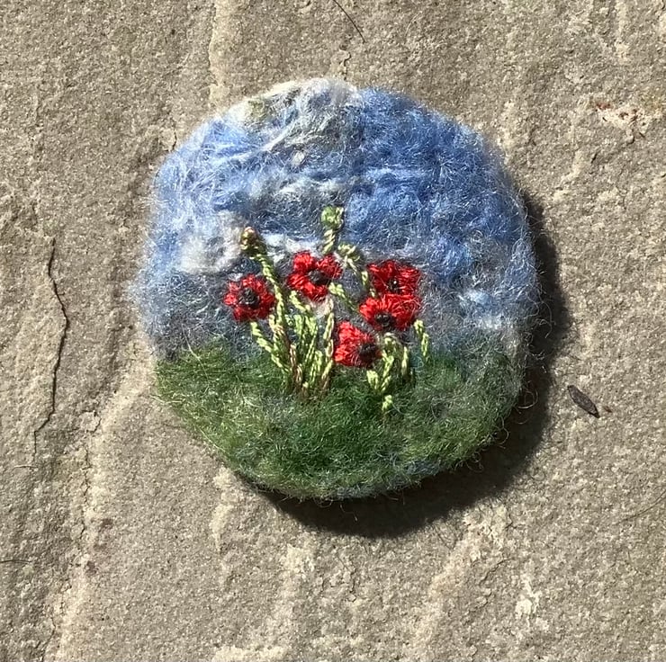 Beautiful poppies needle felted brooch. Needle felted blue sky and green grass background, poppies and poppy seed heads embroidered on to needle felt.