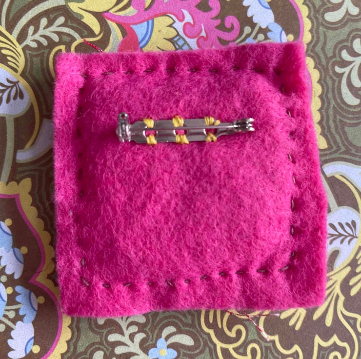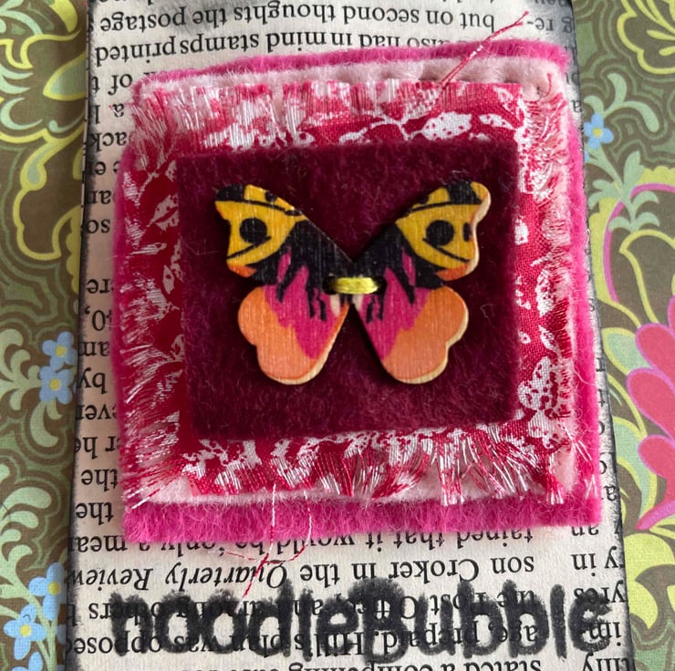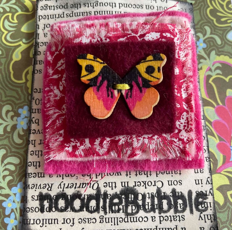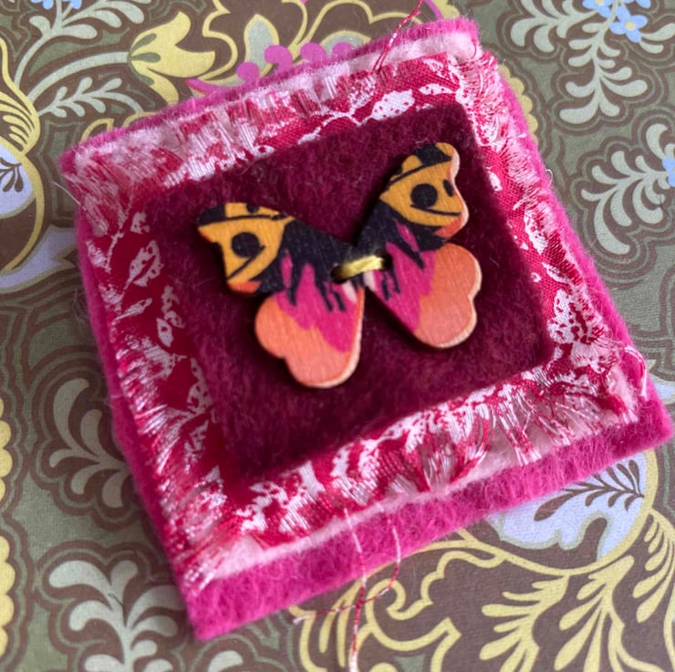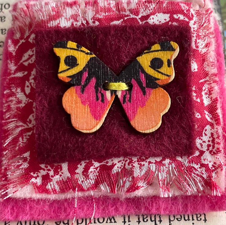 The Pink Butterfly is sewn onto layered vintage fabric & felt