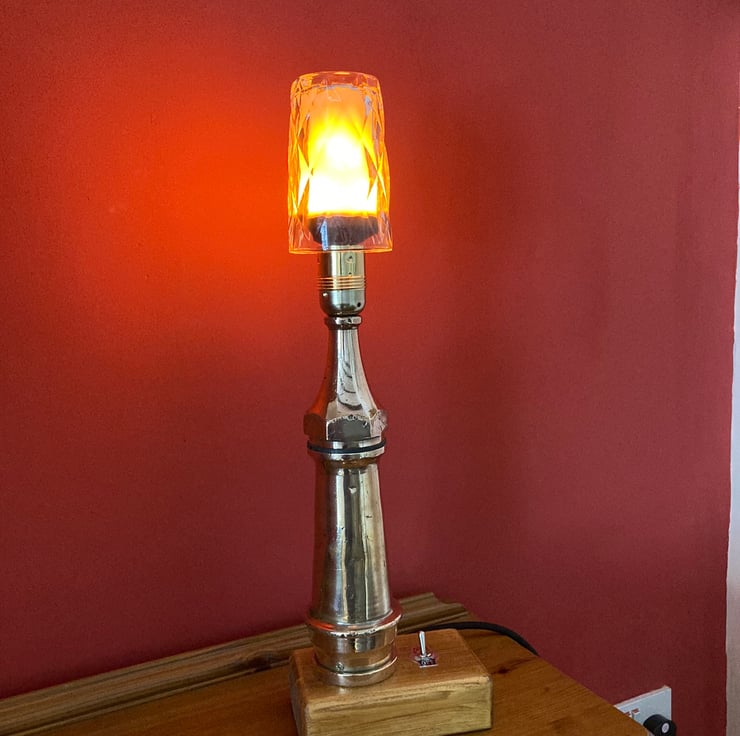 A vintage 1930s or 40s brass fire hose nozzle, or ‘branch end’, converted into a table lamp and fitted with a flame effect bulb for a nice touch of irony. It stands on a French polished base made from offcut 4 x 2 timber with an integrated toggle switch. All electric parts are brand new and CE/UKCA marked.