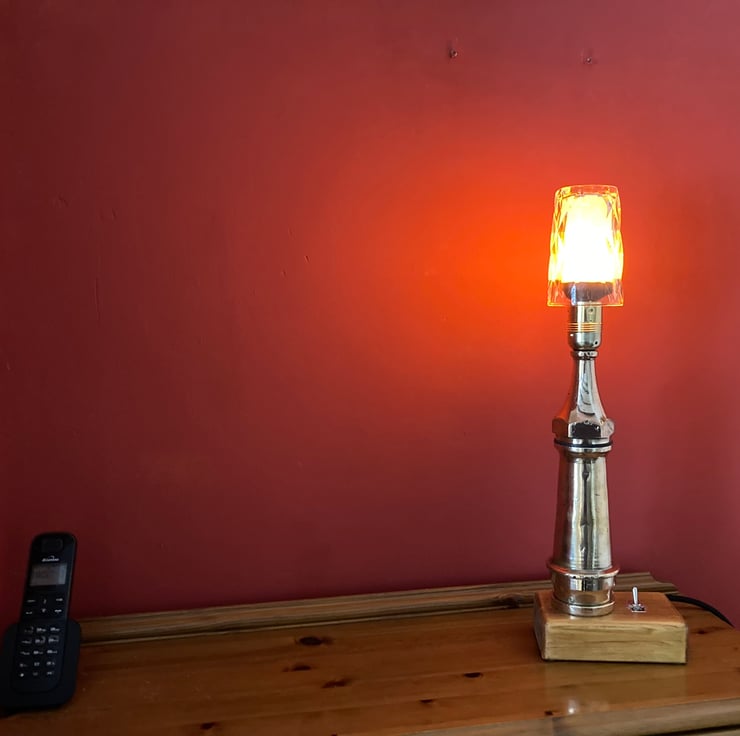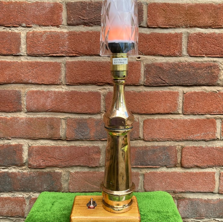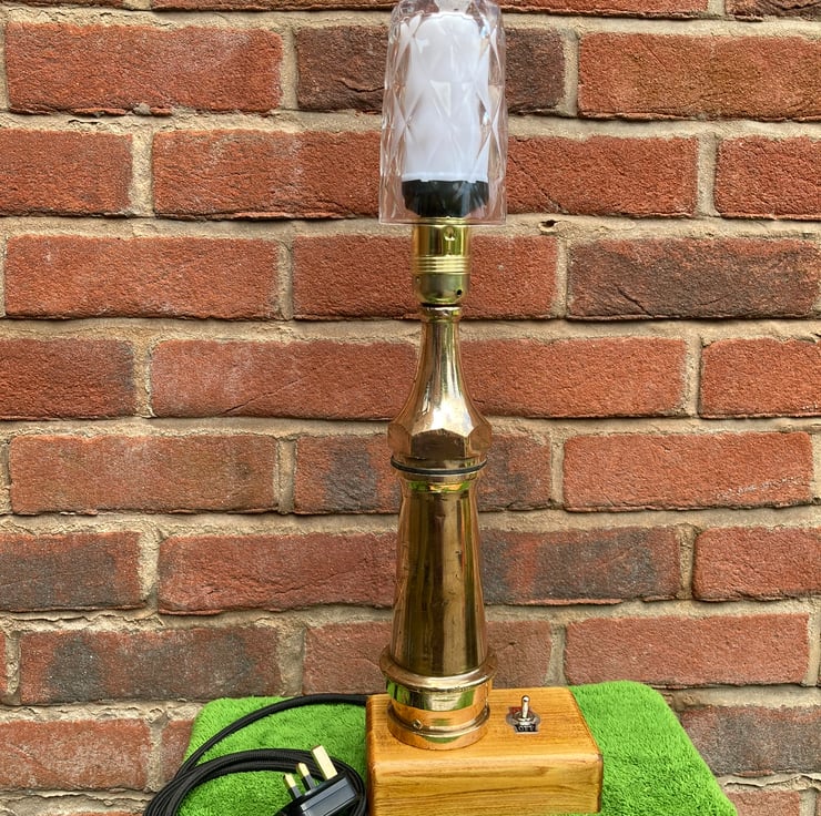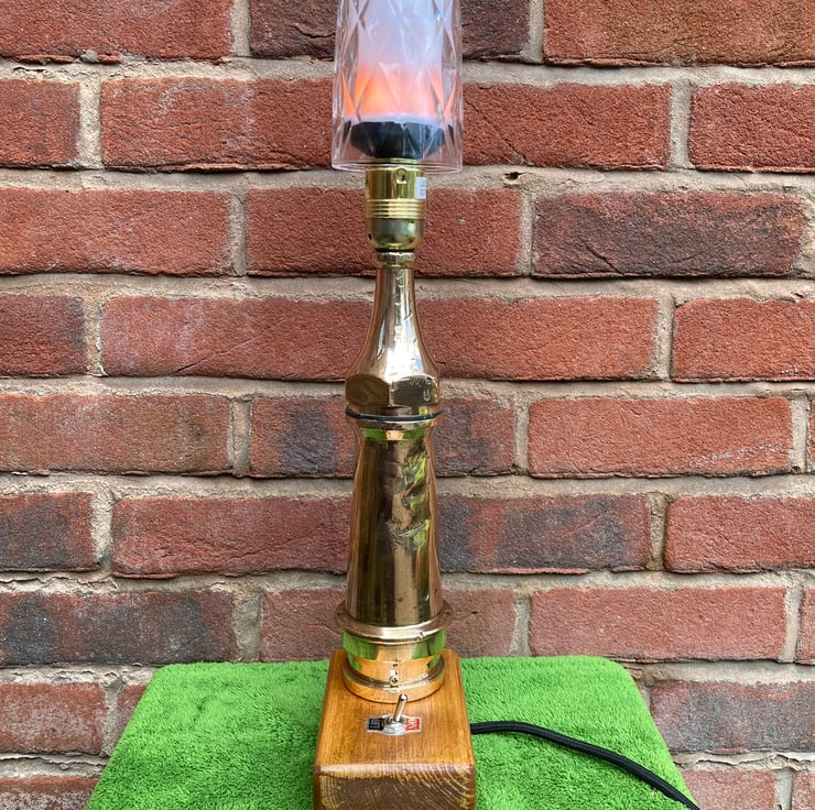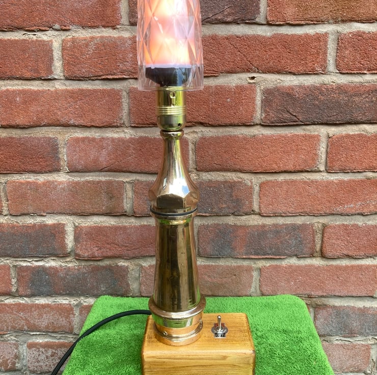 A vintage 1930s or 40s brass fire hose nozzle, or ‘branch end’, converted into a table lamp and fitted with a flame effect bulb for a nice touch of irony. It stands on a French polished base made from offcut 4 x 2 timber with an integrated toggle switch. All electric parts are brand new and CE/UKCA marked.
