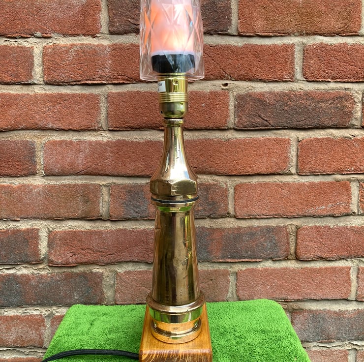 This vintage brass fire hose nozzle was just crying out to be made into a lamp, my sense of humour led me to a flame effect bulb. These bulbs are a lovely effect but not too attractive to look at so a moulded glass shade utilising an old drinking glass finishes the lamp off nicely.