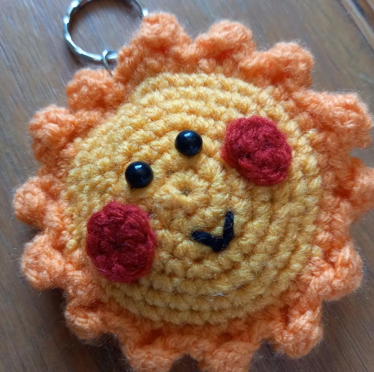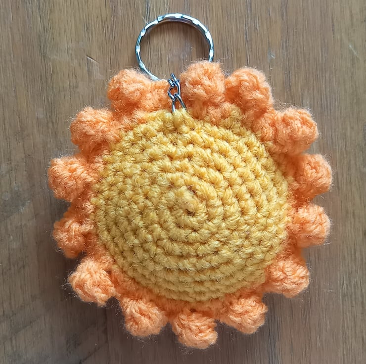 Crocheted with love this cute little sunshine has been carefully crocheted using acrylic yarns in bright yarns & makes a wonderful addition to any bunch of keys.