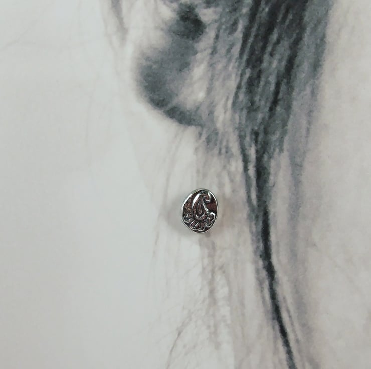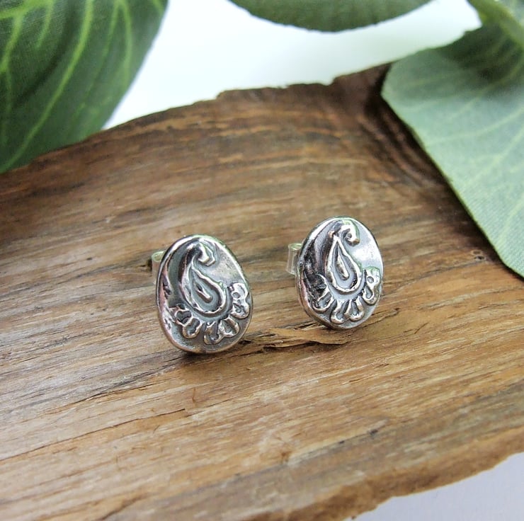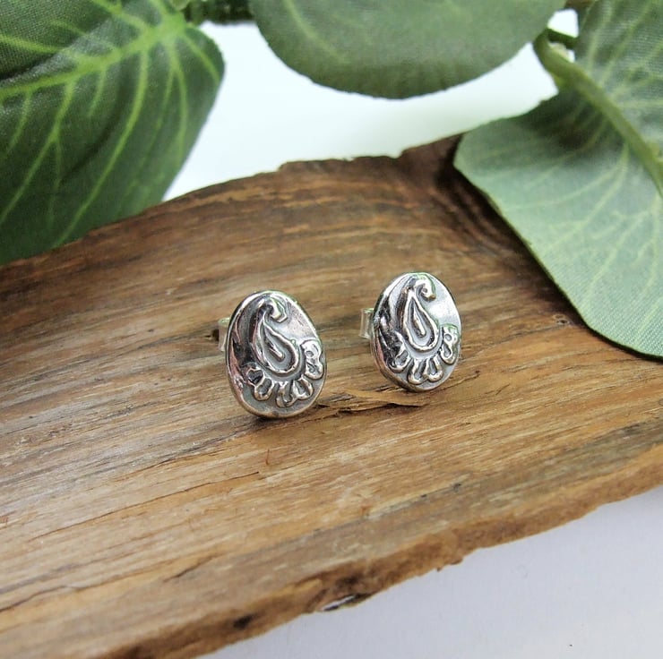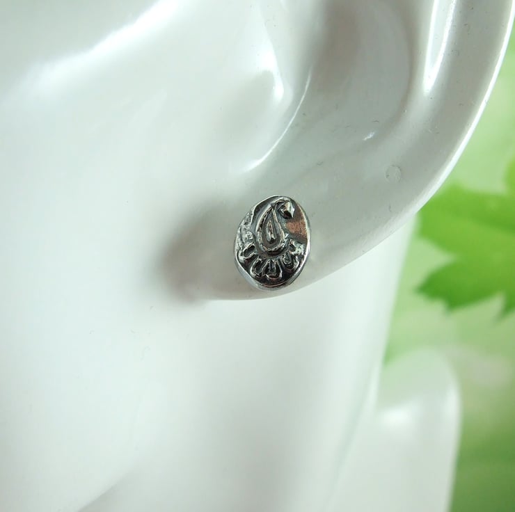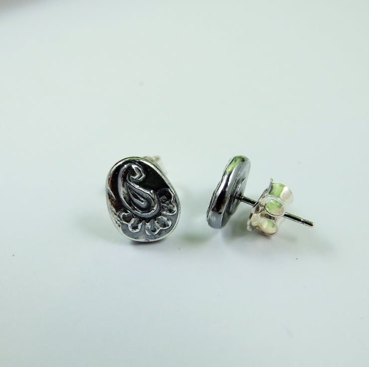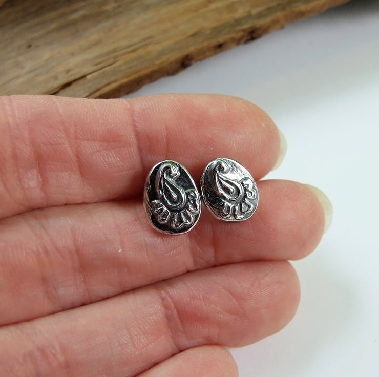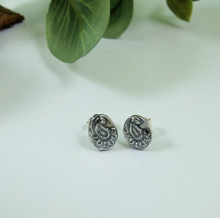 The little studs have been hand crafted from recycled sterling silver, heated to melting point to form a nugget then hammered into a steel texture plate to create the little embossed peacock design. Soldered to regular .925 sterling silver ear posts with butterfly backs and given an oxidised finish.