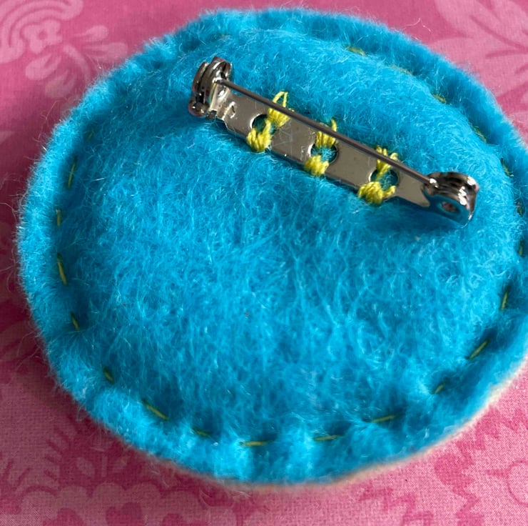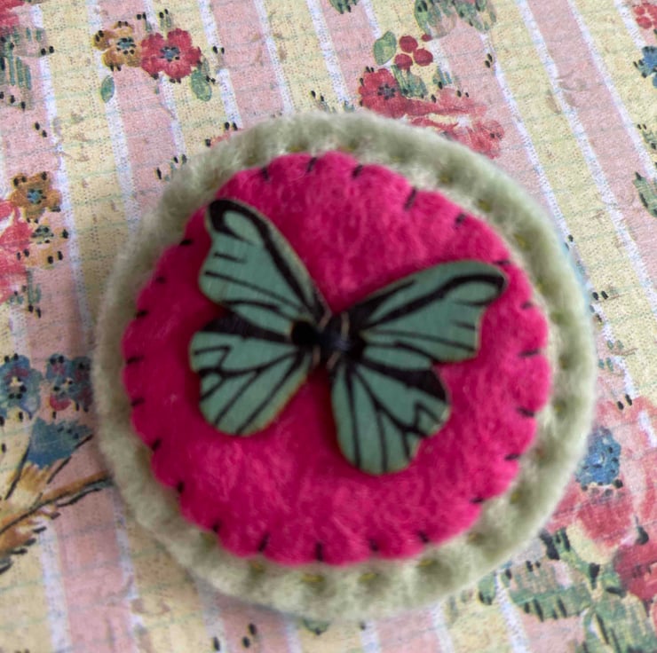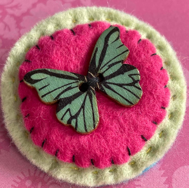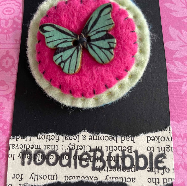 Wooden Butterfly is sewn onto bright pink & pale green felt