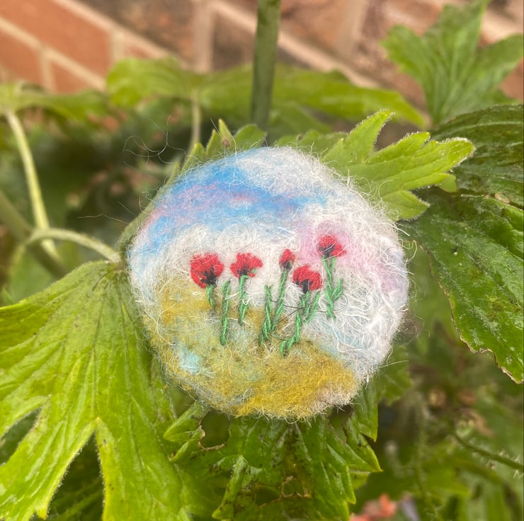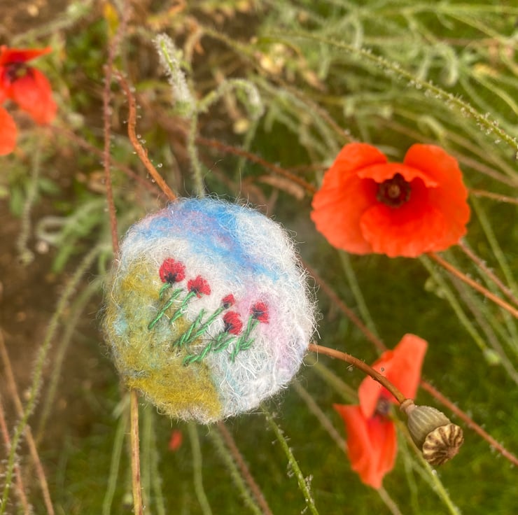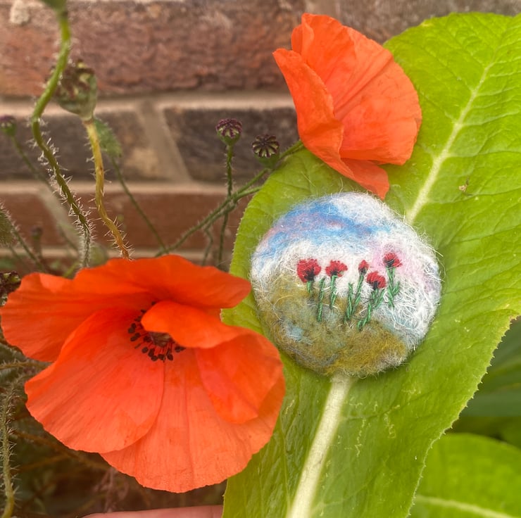 A field of poppies embroidered on to a needle felted background. Beautiful red poppies set against a blue sky, with a touch of red, sitting in a green and mustard coloured field.