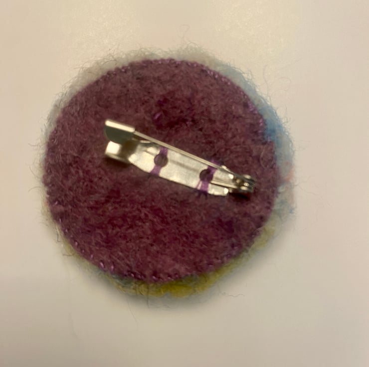 Fastens with a metal brooch bar which has been hand stitched on to a felt backing.