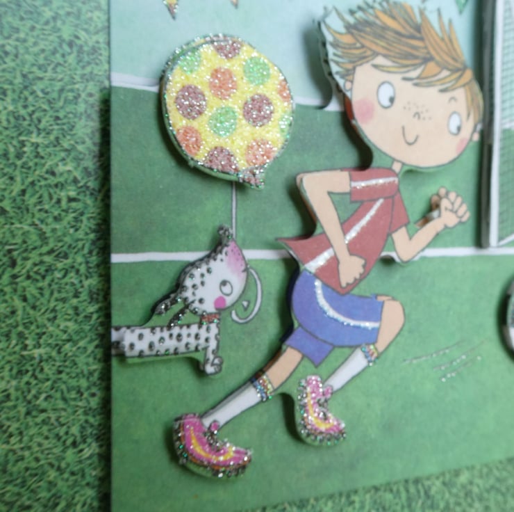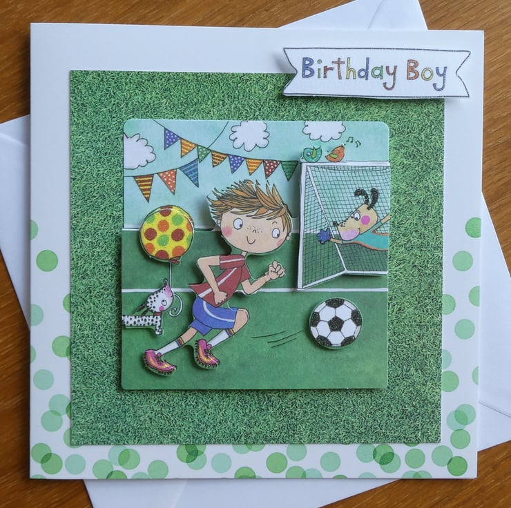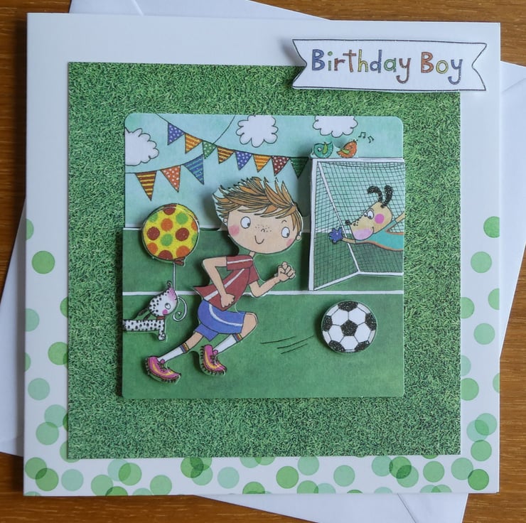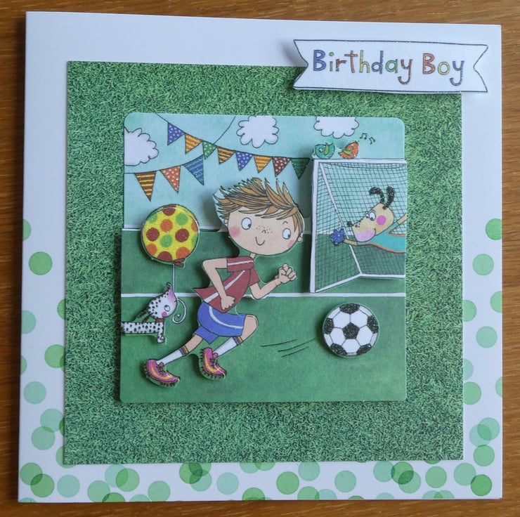 The design has been mounted onto a background of card with a green grass effect and then onto a white card base with bright green dots in a random pattern. A banner style message with the words 'Birthday Boy' has been added at the top to complete the design.