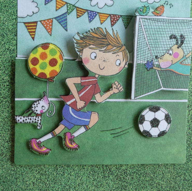 This birthday card with a striker heading for goal would be ideal to send birthday wishes to a little footballer or football fan.