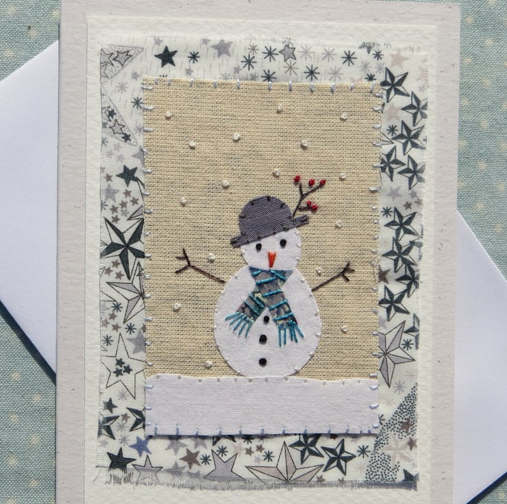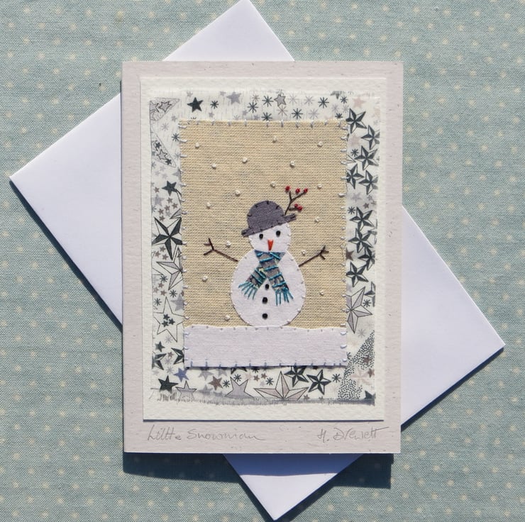 All my cards measure 12 x 9 cm (5" x 3.5") and come with toning recycled paper envelopes in clear protective compostable cornstarch sleeves - no plastic! Each card is signed on the front and my studio stamp is on the back. Cards are made from stout 100% recycled card - blank inside. The title is written below the textile: 'Little Snowman'.