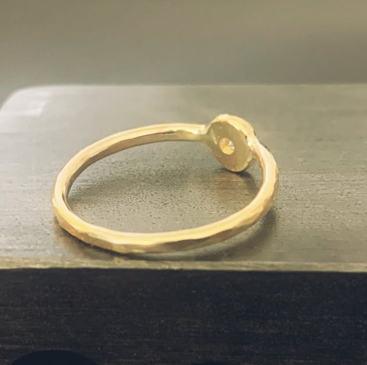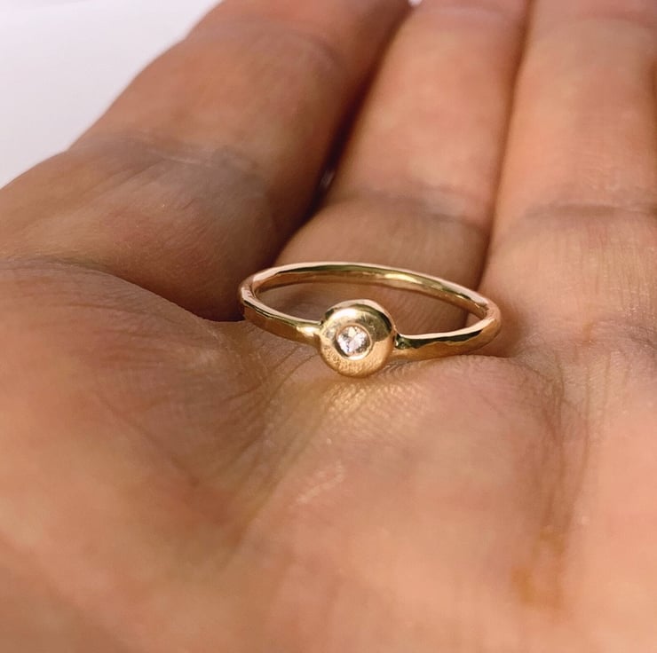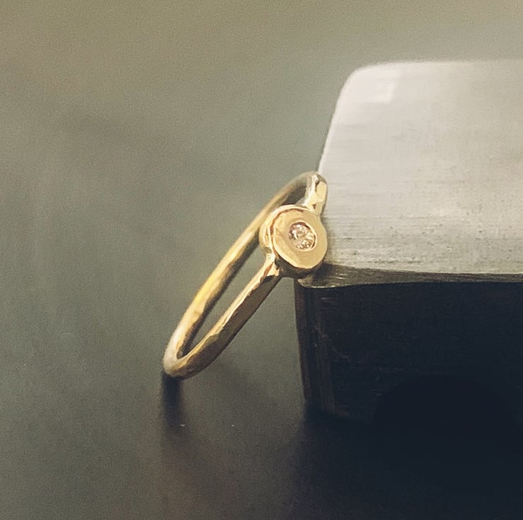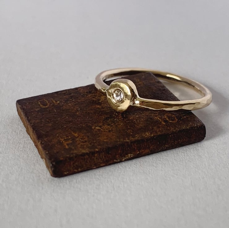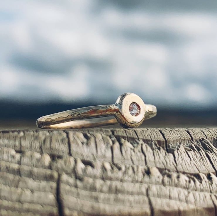 Made with 9 carat recycled gold, melting 9 carat gold into a ball and hammering down flat, carefully setting a little 2 mm dazzling diamond.