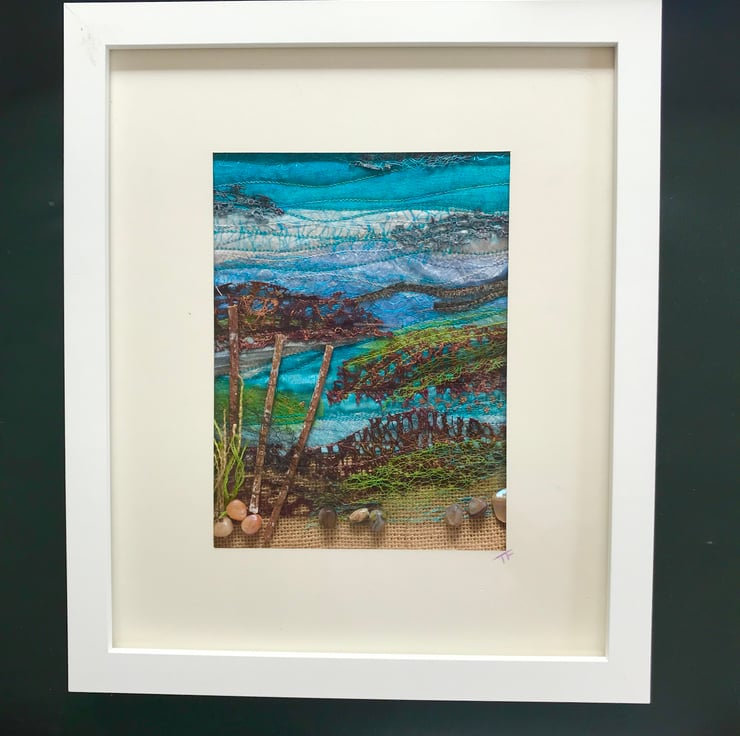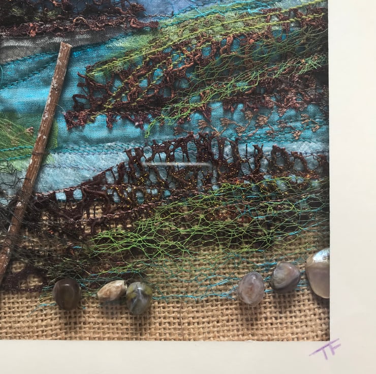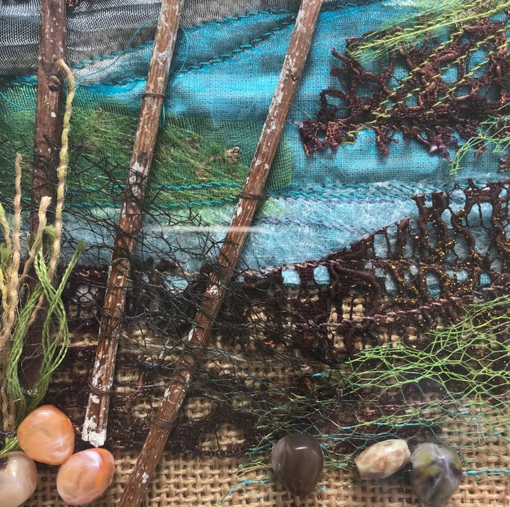 Textures of the coast using organza , painted lace and hessian, over stitched with machine embroidery.