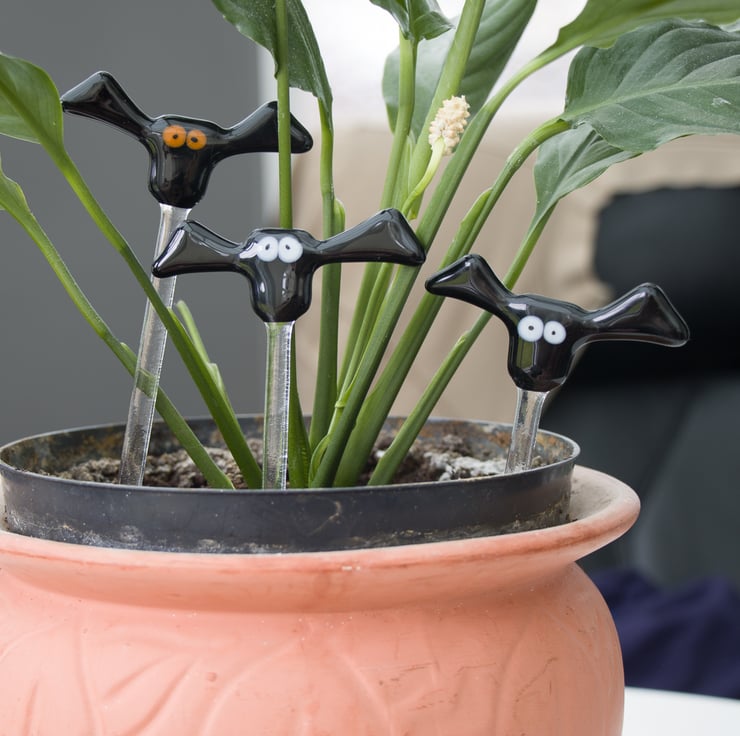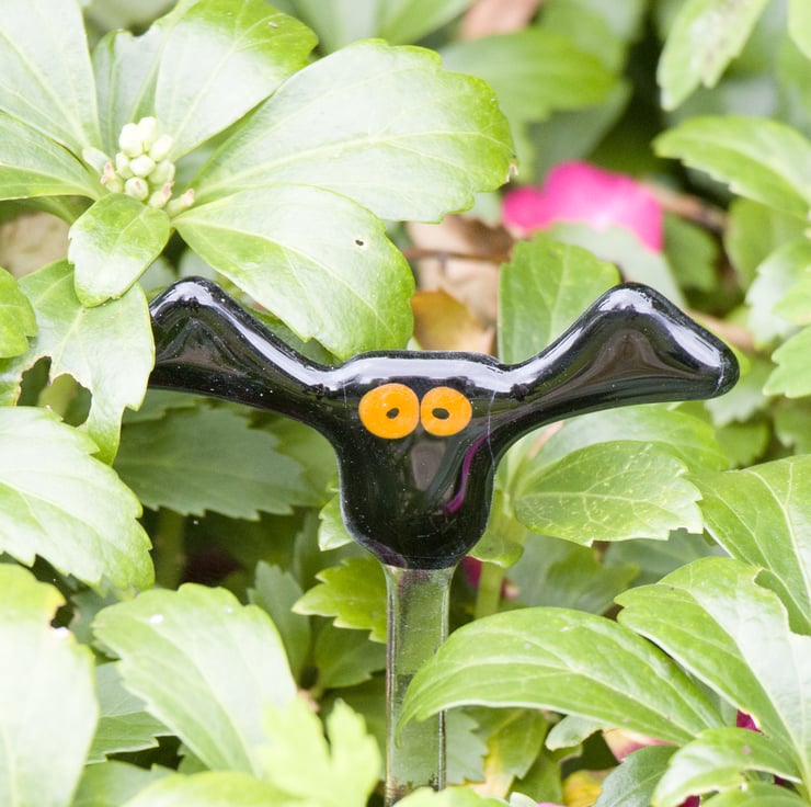 Each Pot Bat is made from pieces of hand-cut glass that have been fused together to form the body and wings. Pre-fused glass dot is used to make the eyes. A clear glass stalk gives the impression that the bat is floating in mid-air.