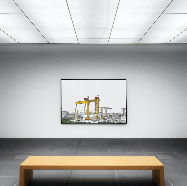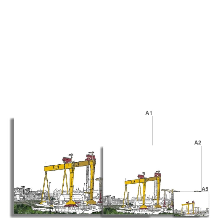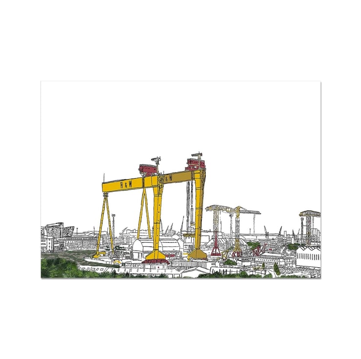 Introducing the Harland & Wolff Fine Art, a stunning masterpiece that captures the essence of Belfast's iconic cranes, Samson & Goliath. This painting offers a unique view of the entire Titanic quarter, beautifully captured in the artist's own unique style. This piece is sure to make a bold statement in any space and is a must-have for any fine art collector. Bring a piece of Belfast's rich history and stunning skyline into your home with this captivating work of art.