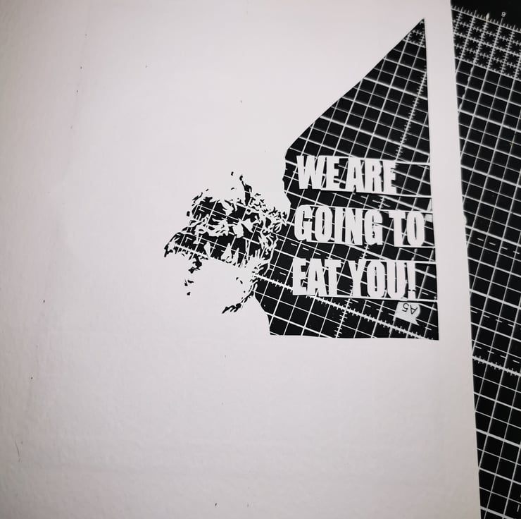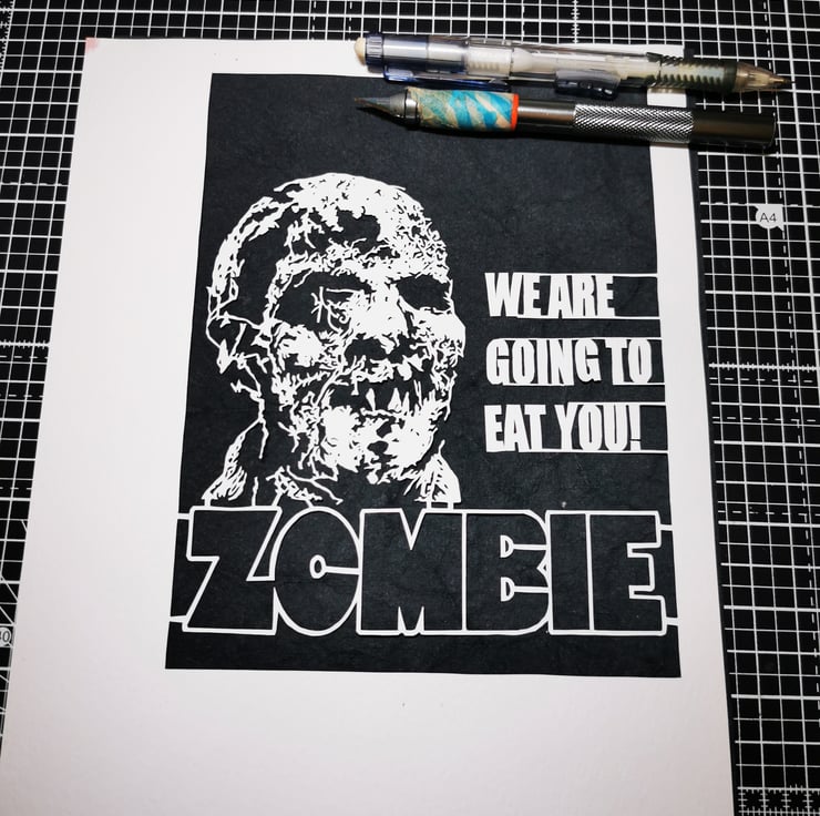 Mounted but unframed poster-style artwork of the classic zombie head image from the horror classic 1979 Lucio Fulci film. Also containing the words, "Zombie, we are going to eat you". Hand cut from a single sheet of bone white paper, mounted over a black background in a white mat ready to be framed.
