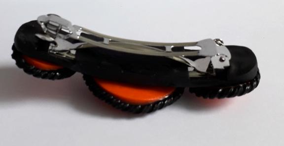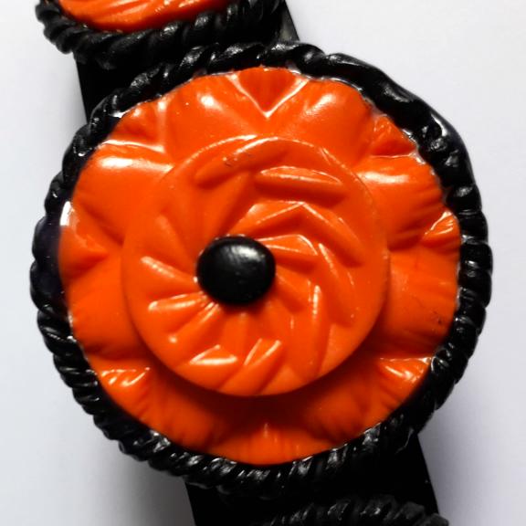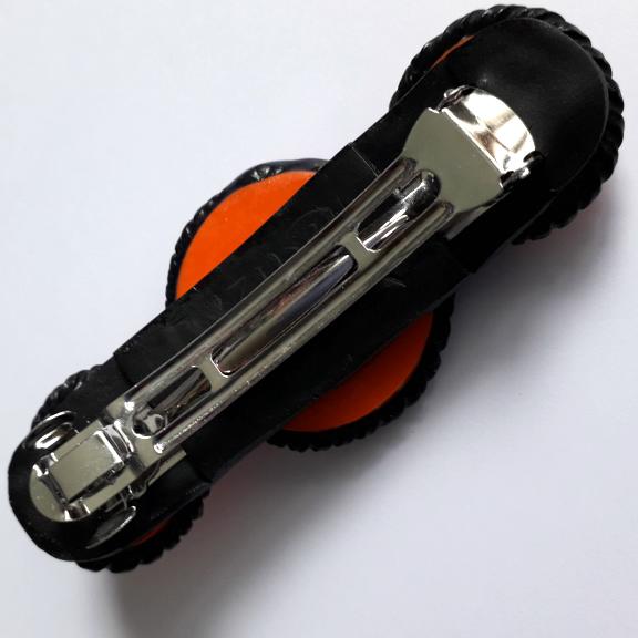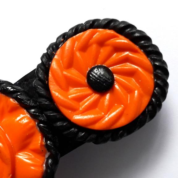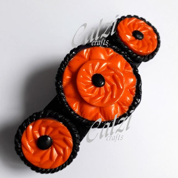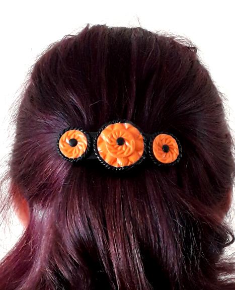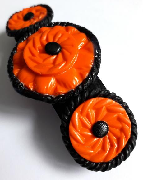 This wheel design hair barrette has been made with orange and black polymer clay, with Halloween in mind, but I am happy to make it in other colours. I first covered a blank metal barrette with black clay then formed the orange wheels to go on top, the wheels have a twisted black edging and there is a black circle in the centre of each one.