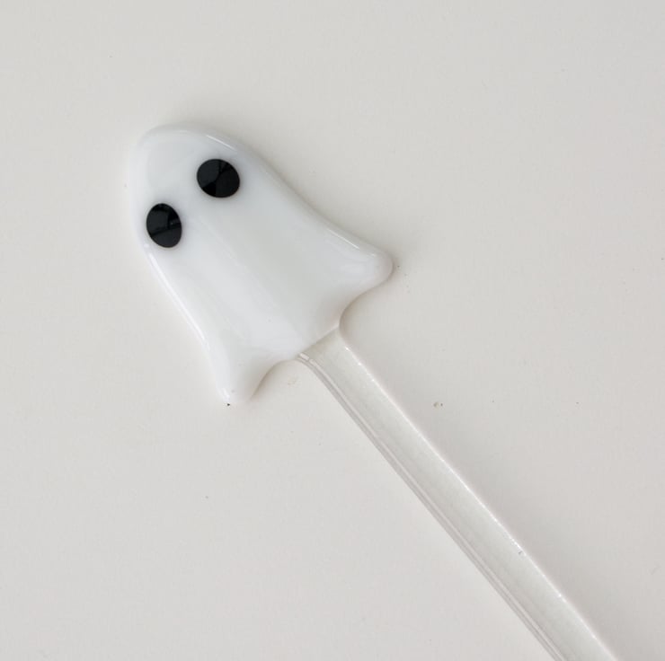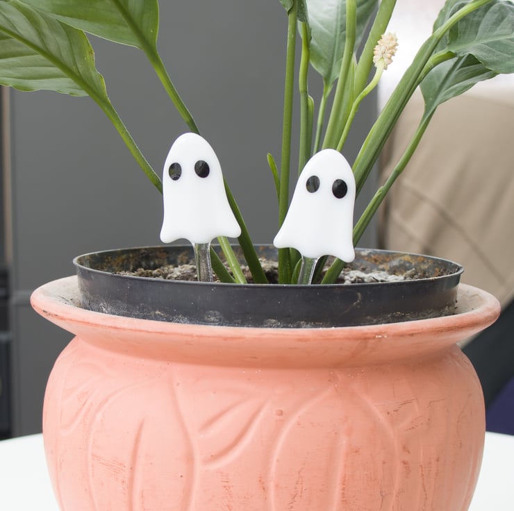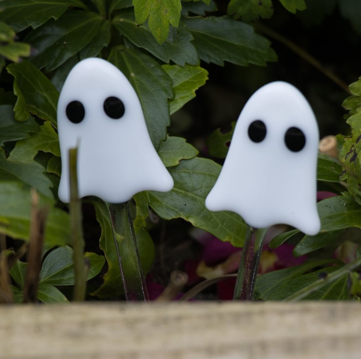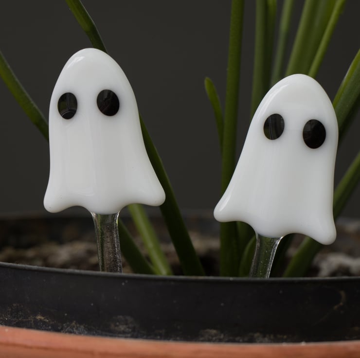 The body of each Pot Ghost is made from a piece of hand-cut glass Pre-fused glass dots are used to make the eyes. The body is fused to a clear glass stalk which gives the impression that the ghost is floating in mid-air.