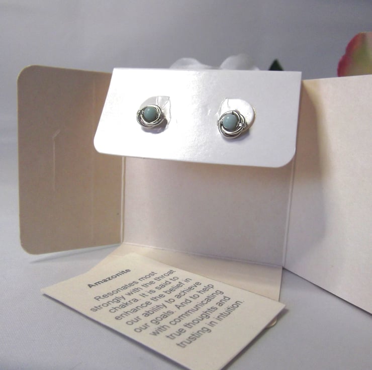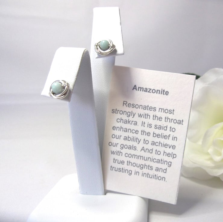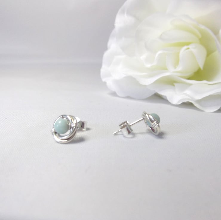 Hand crafted from recycled silver, these stud earrings feature a simple yet elegant Russian wedding ring design. At the centre of each earring is a stunning soft blue/green Amazonite gemstone bead.