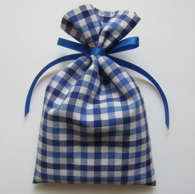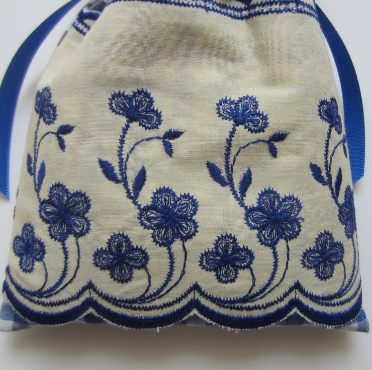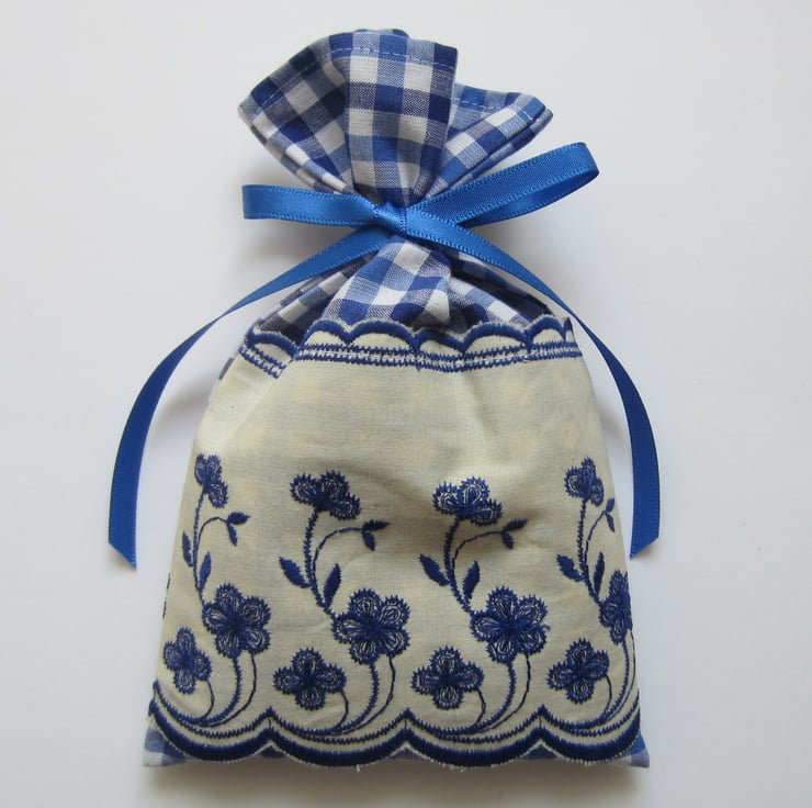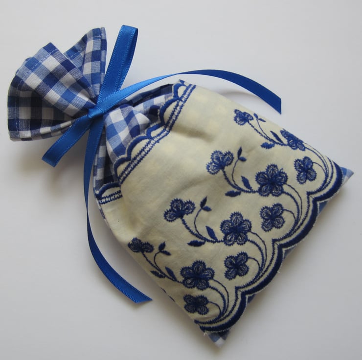 Lavender drawer sachet made from blue and white gingham and decorated with a vintage embroidered blue flower design trim.