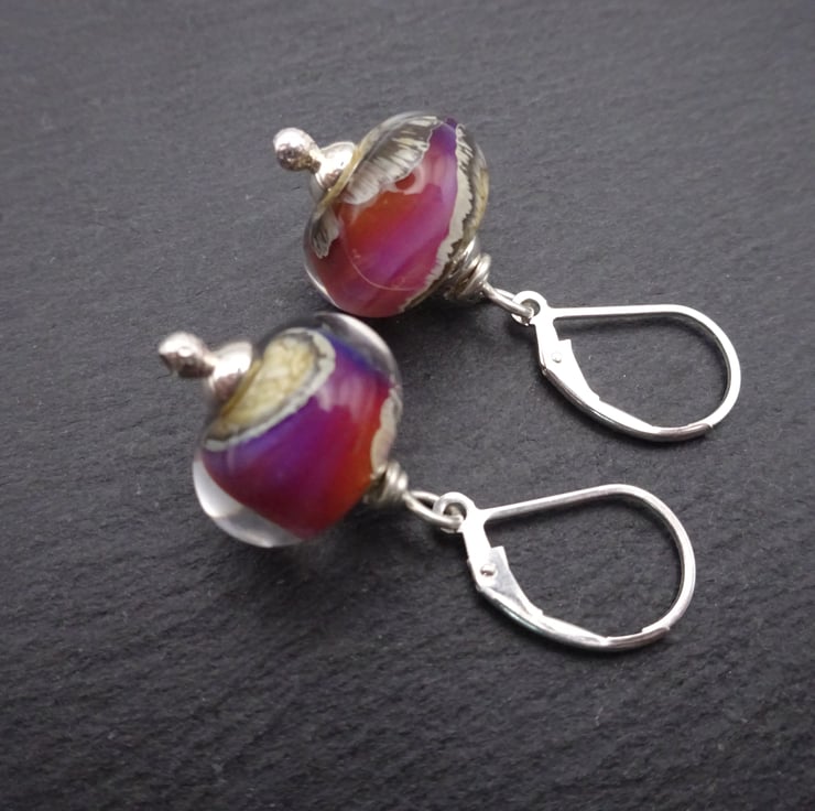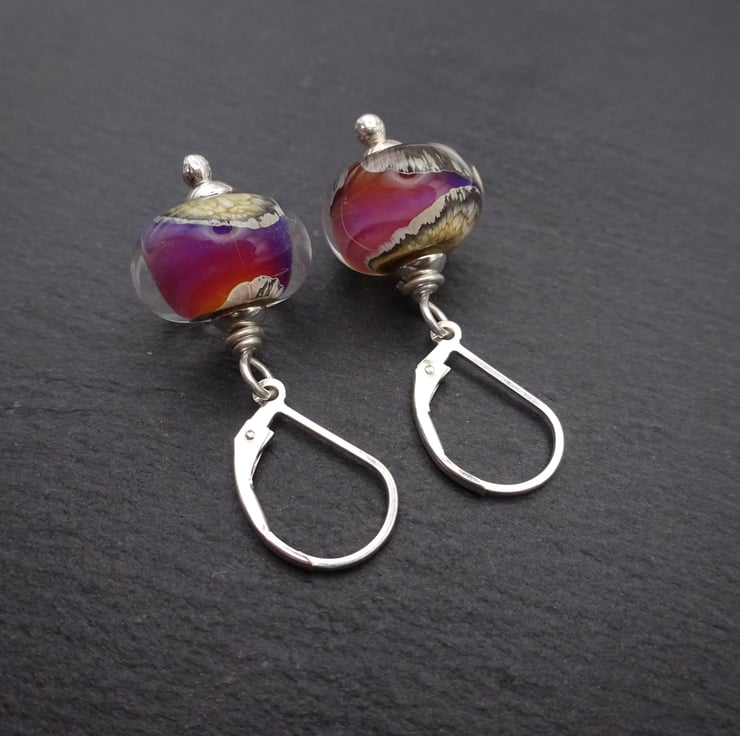A pair of earrings made with sterling silver lever back ear wires, sterling silver beads and handmade lampwork glass beads.