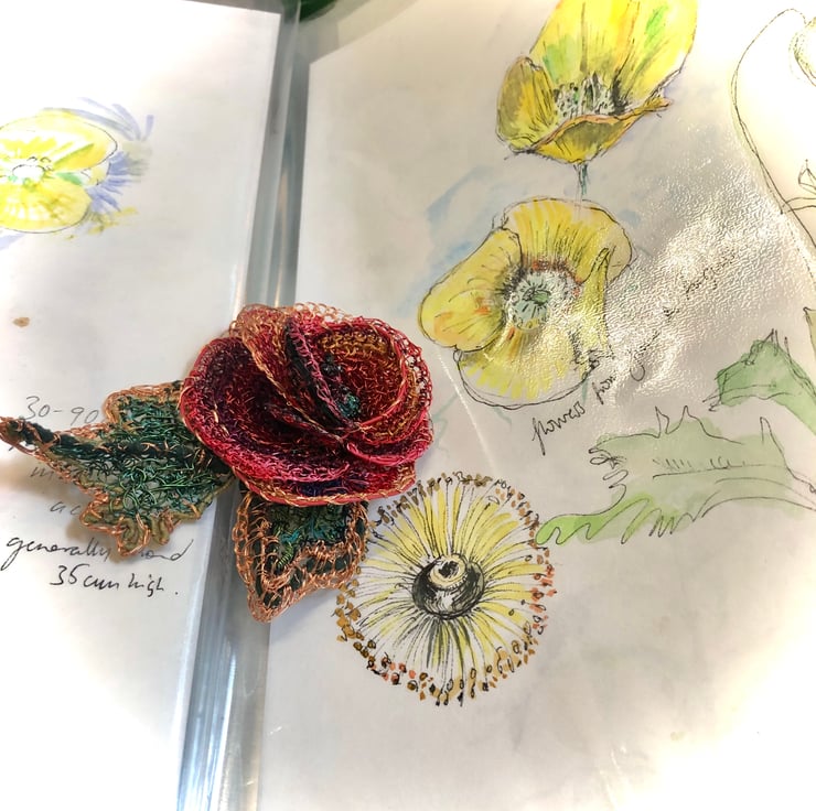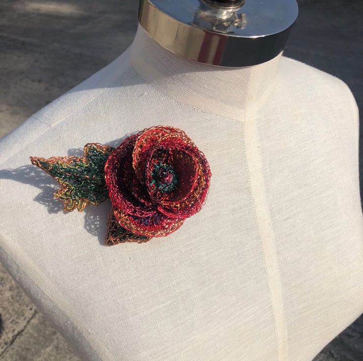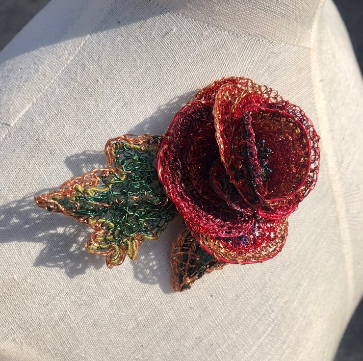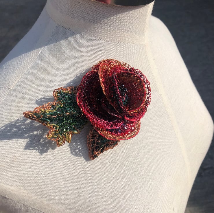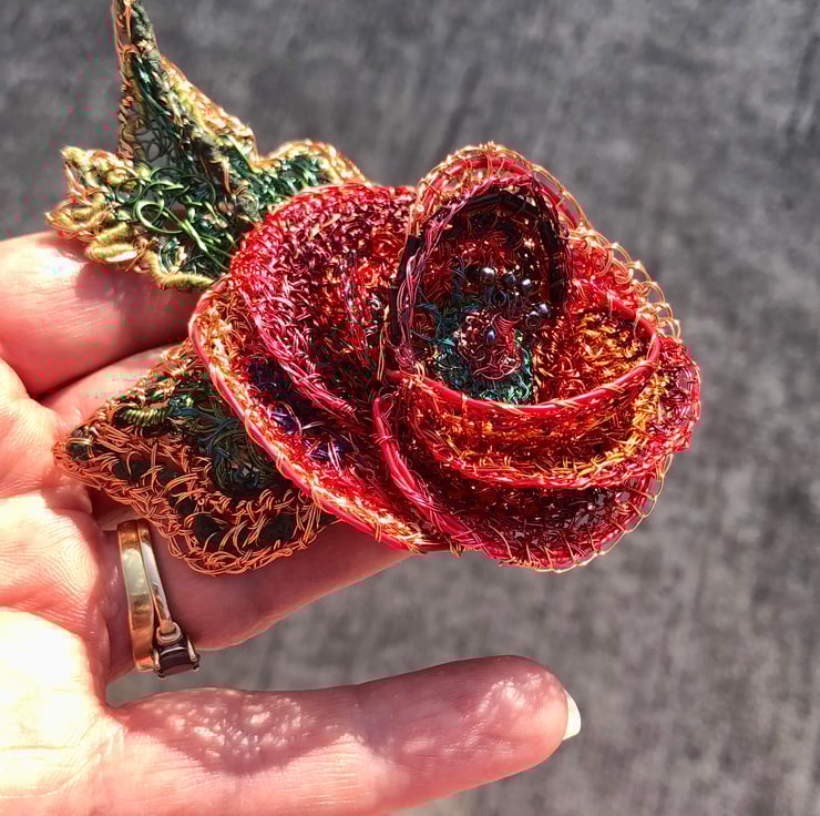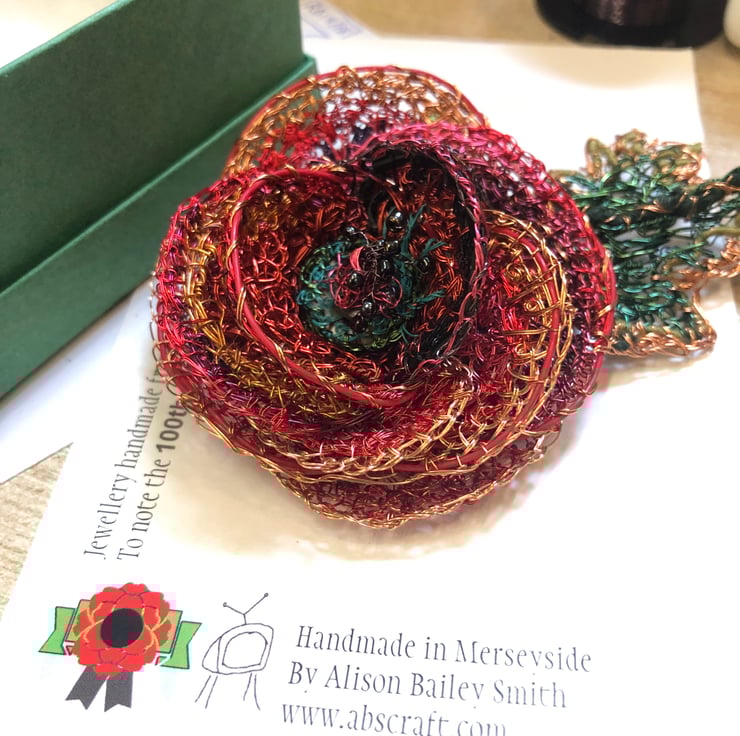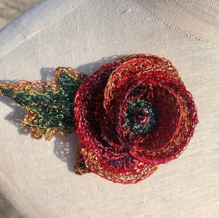 Commemorative poppy brooch for a stylish and eco conscious wearer. Made from wire repurposed or upcycled from old televisions, telecom wire, repurposed fabric, vintage beads repurposed from old necklaces and mourning beads. Large in scale at 10 centimetres across with two leaves and eight petals. Plastic recycled from a conditioner bottle on reverse.