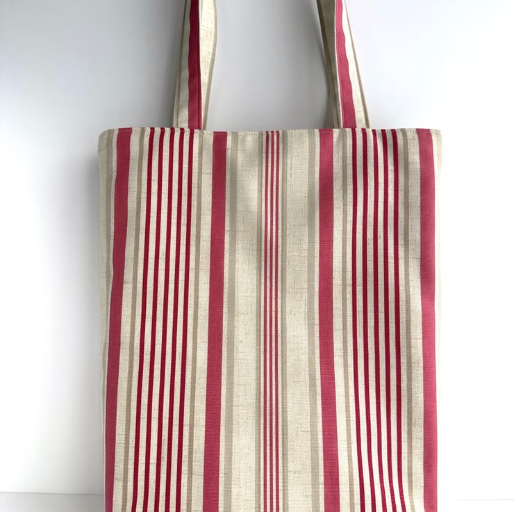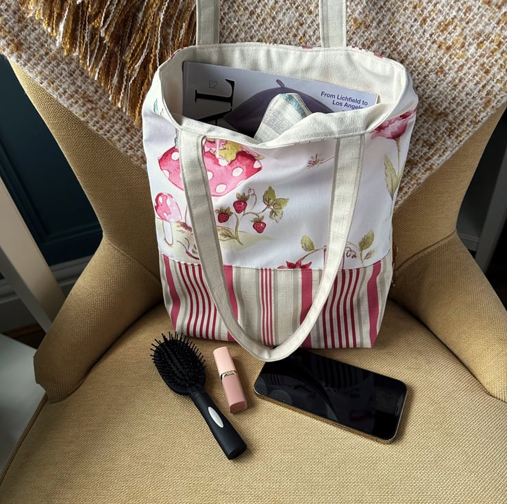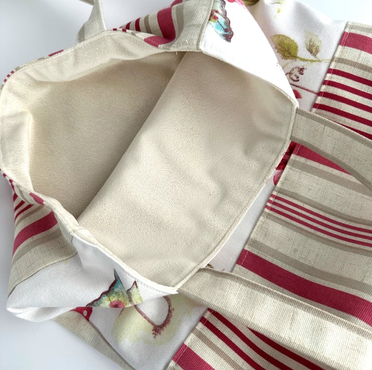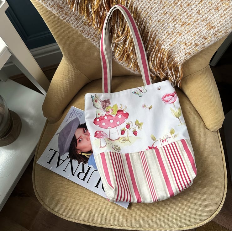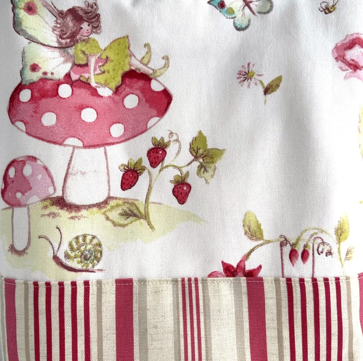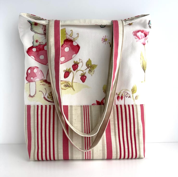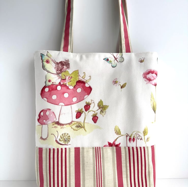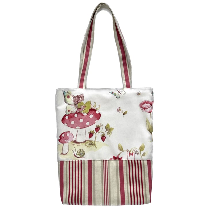 Tote bag with fairy sitting on a mushroom. A pretty tote bag made from two different fabrics that complement each other beautifully. The upper front is made from a delightful print fabric featuring a cute fairy in a lime green dress, sitting on a mushroom. The scene also incorporates a butterfly, bee, snail, strawberries and flowers, and is depicted in pretty pastel shades of coral pink, red, zesty green and blue on a white background. The lower front, the entire back and the handles are made from candy striped fabric in shades of coral pink, red, cream and beige. The bag is lined with velvety cream fabric that looks a bit like suede.