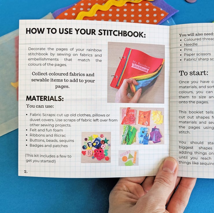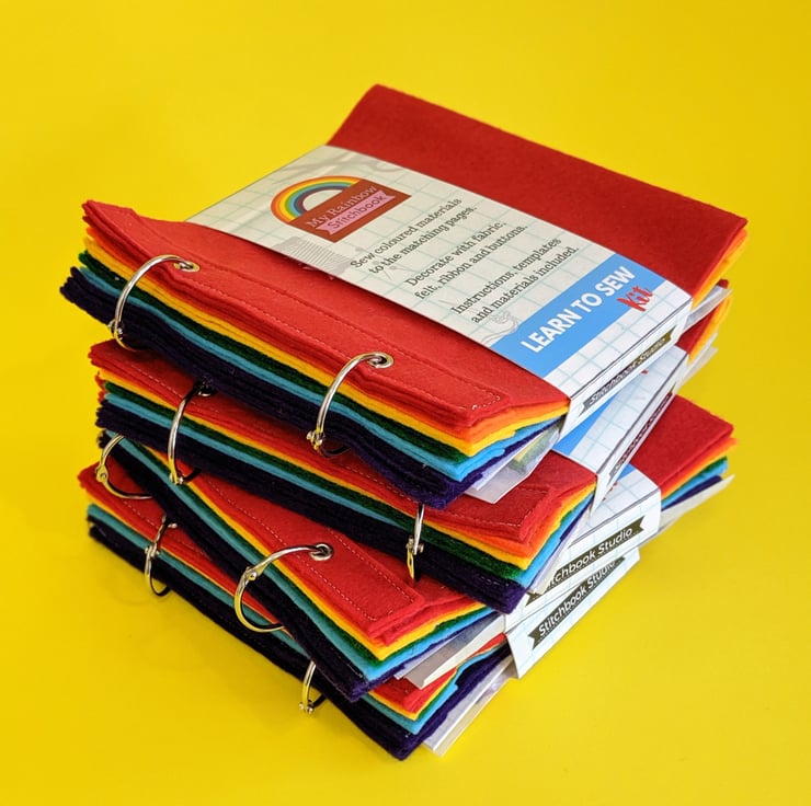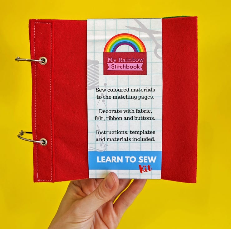 A great way for children to learn to sew - by filling this rainbow Stitchbook full of colourful fabric and embellishments.