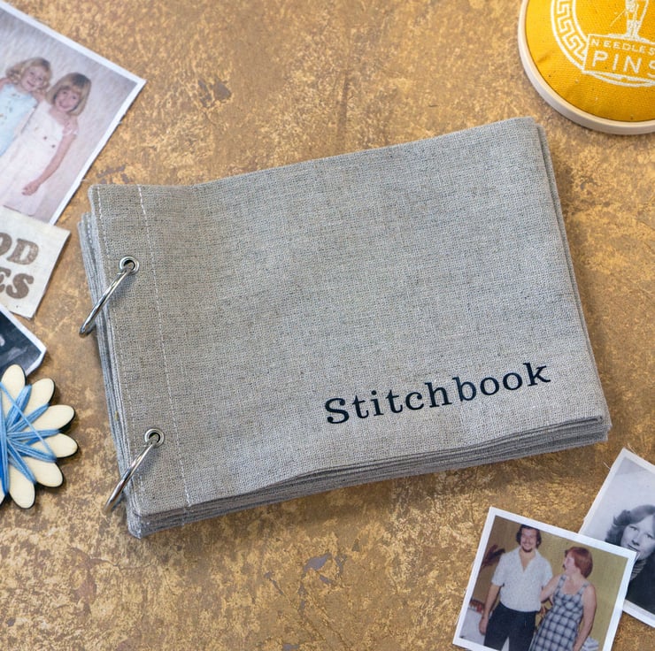 Including ring bindings the book measures approx 21.5cm x 13.5cm (8.5" x 5.25") and the sewing area for each page is 17.5cm x 13cm (7" x 5"). The book has a vinyl title 'Stitchbook' on the front cover and the Stitchbook logo on the back. These can be incorporated into the design or covered with fabric or stitching.