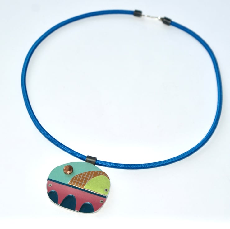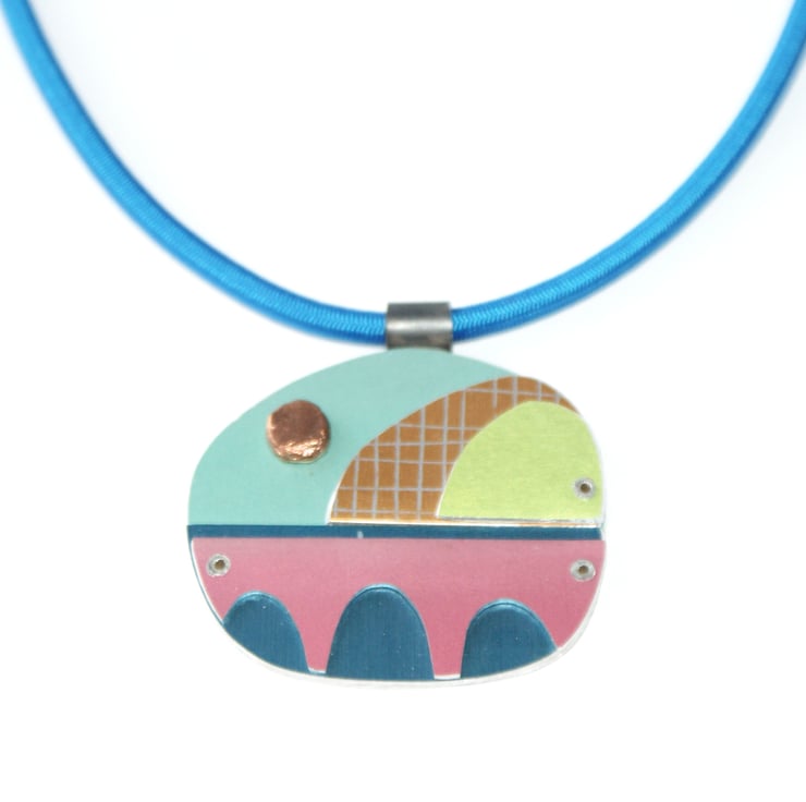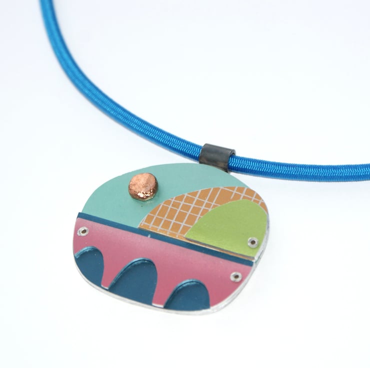 A one of kind necklace hand crafted from layers of anodised aluminium with copper detail. The coloured parts feature my own patterns and the pieces have been immersion dyed then cut and finished before being layers together and joined with silver rivets.