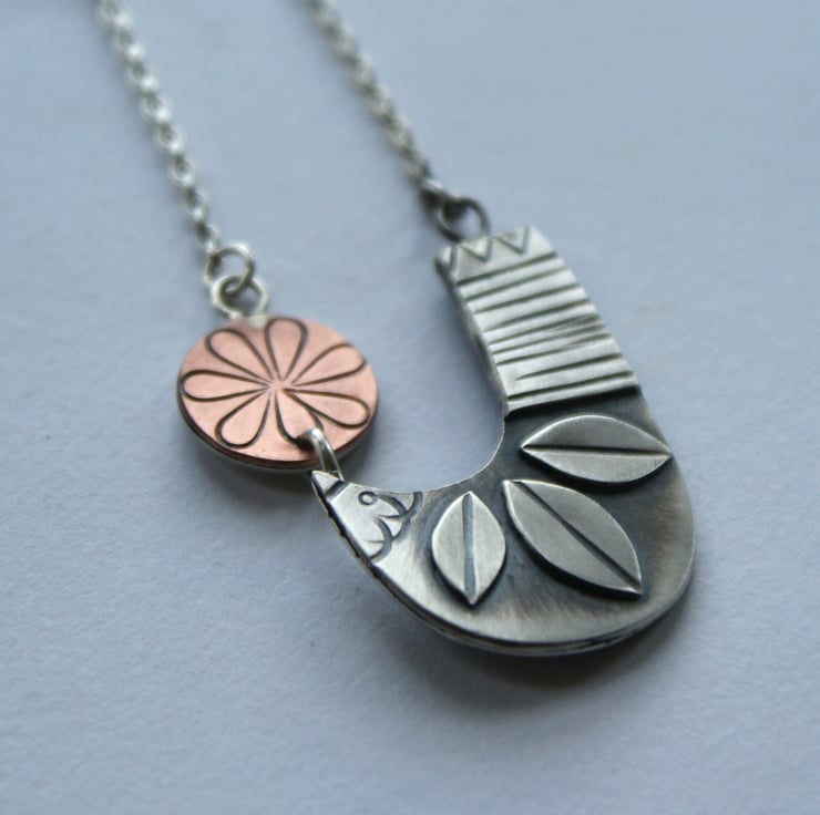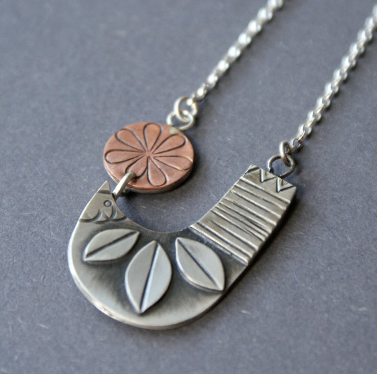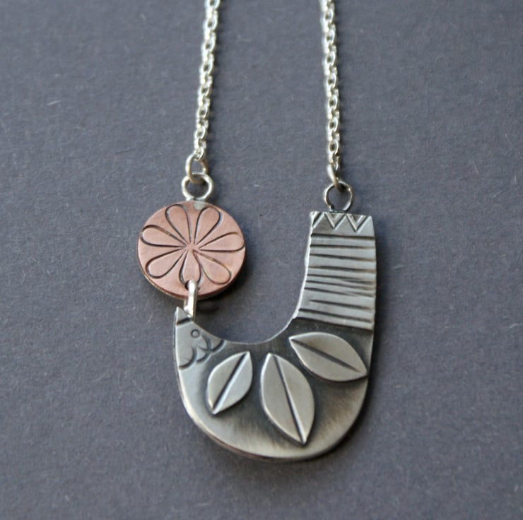 A quirky necklace featuring a stylised bird and a sun hand cut from layers of silver and copper. The pieces have been cut and textured before being soldered together, oxidised and partly polished back to a satin finish.
