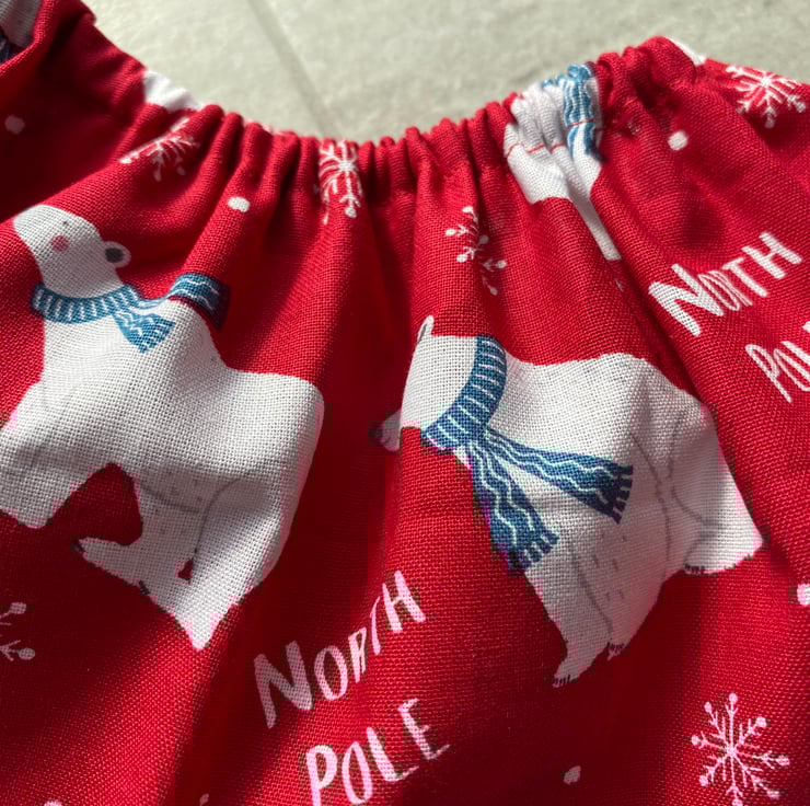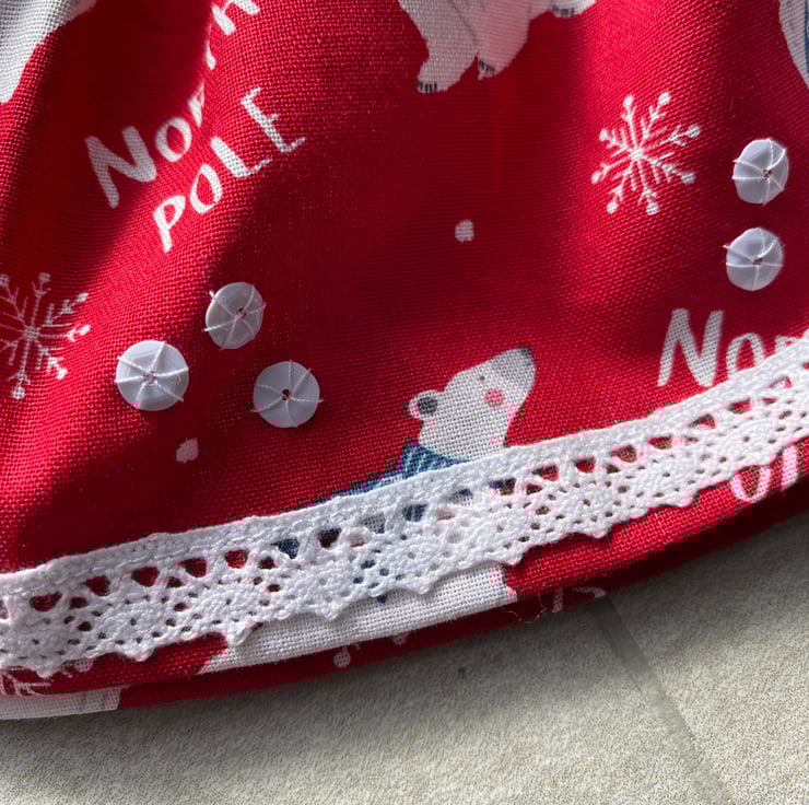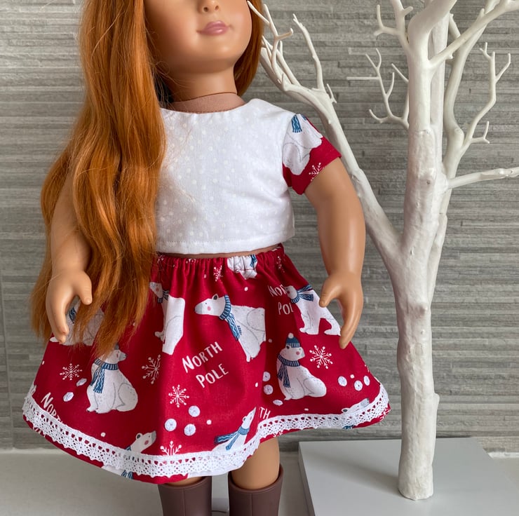 Dolls skirt with elastic waist that just pulls on. Skirt is red with white polar bears featured on the fabric. Skirt is trimmed with white lace and a few white sequins. Top is a cropped style, lined, with a polka dot print within the fabric.