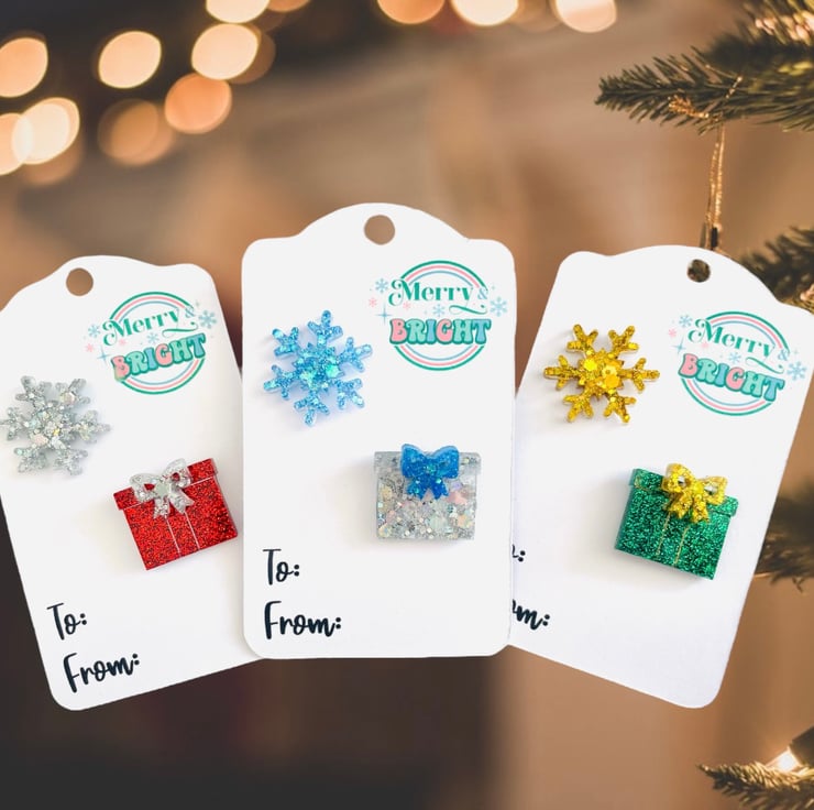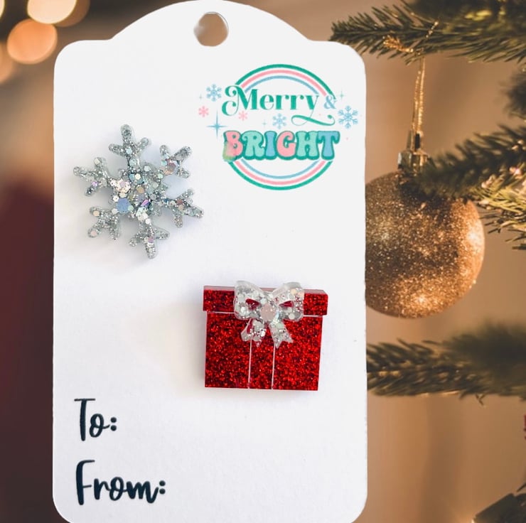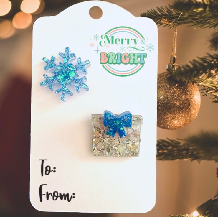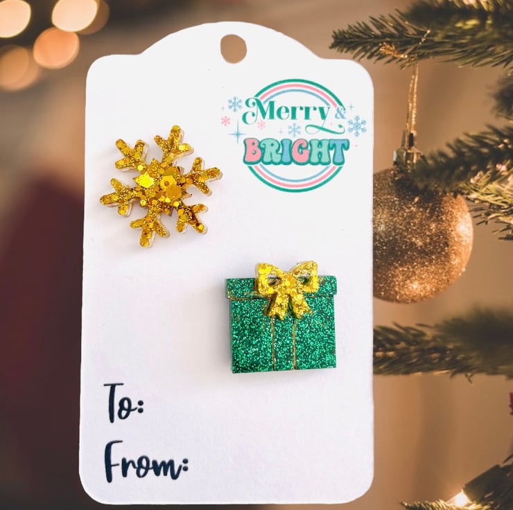 A double pack of Christmas pins featuring a snowflake and a present. These statement brooches will look great with your favourite Christmas outfit! Made with resin and various glitters.
