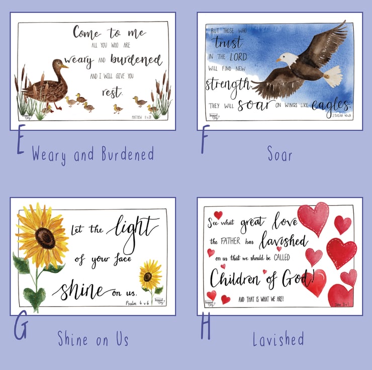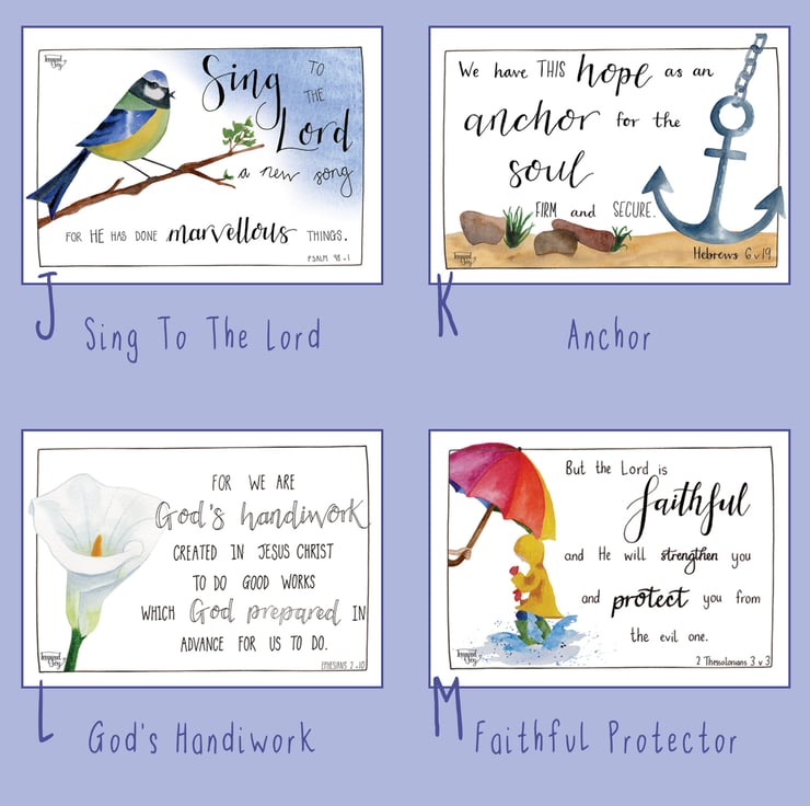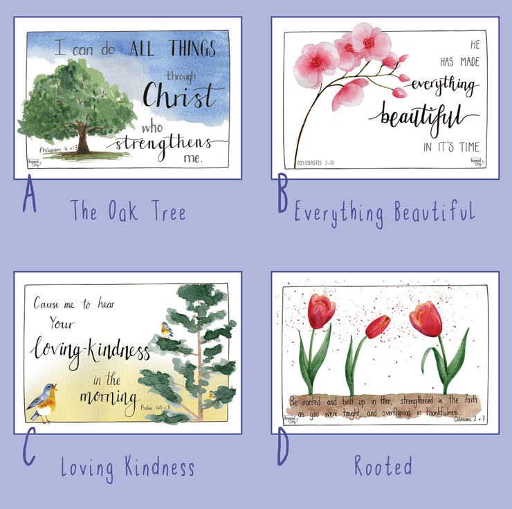 All designs include an encouraging hand lettered bible verse and a watercolour illustration. They are printed onto 300gsm smooth white card and come with a blank back ready to be written on if required.