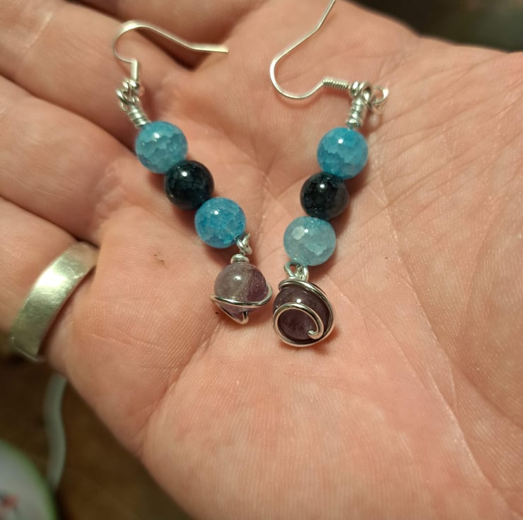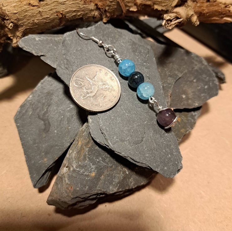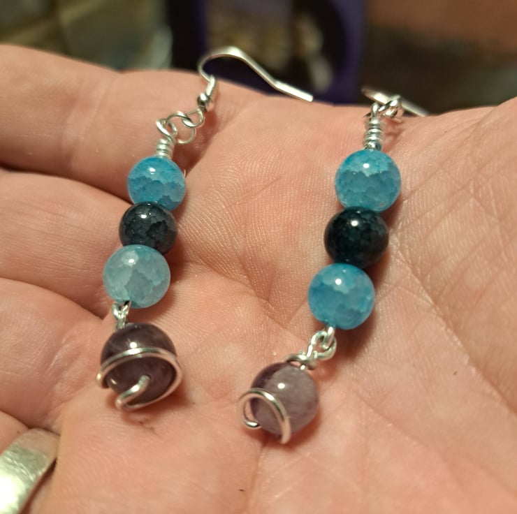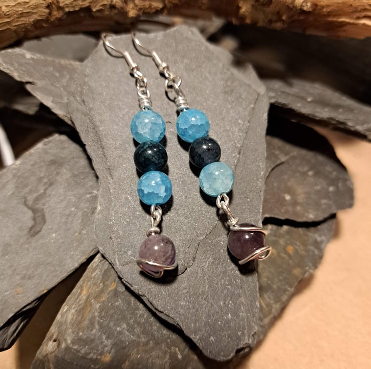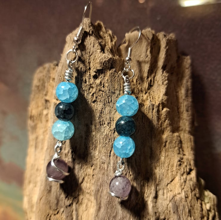 Materials: These earrings feature two captivating sky blue crackle glass beads, one rich dark green bead, and a stunning articulated purple crackle glass bead that gracefully sways at the bottom.