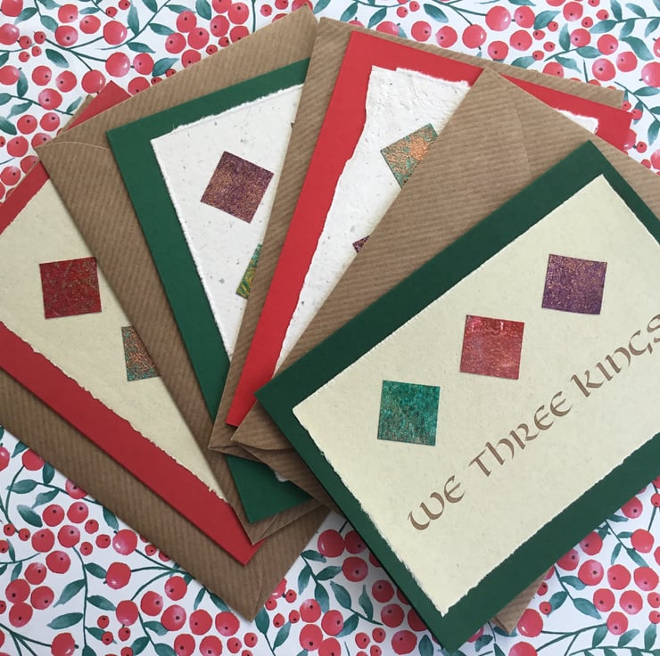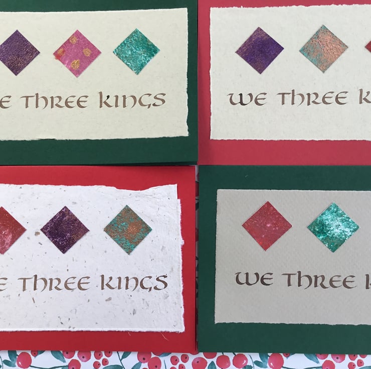 Set of four handmade Christmas cards on the theme of the carol “We Three Kings”.