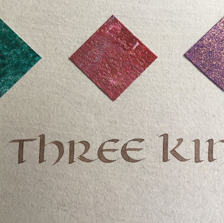 Squares of paste paper I have made in purple, red and green with gold highlights represent the kings, and the calligraphy lettering is done in walnut ink with a metal nib. This script is the Uncial script, which was widely used in monastic manuscripts .