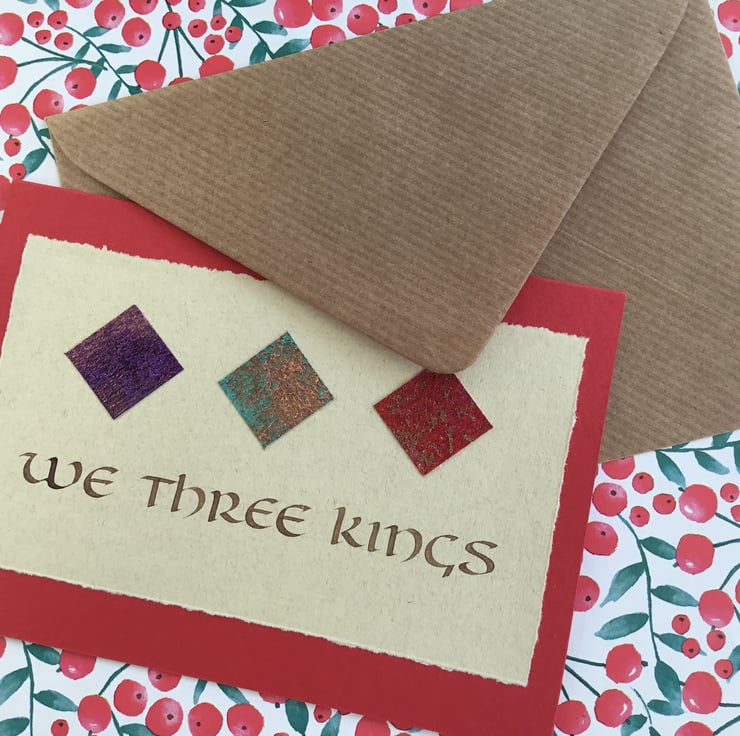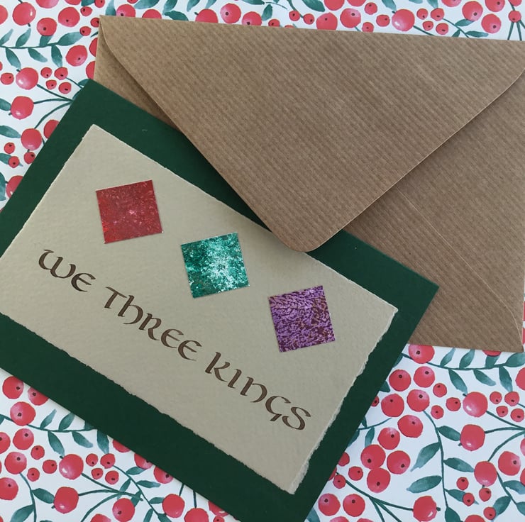 I love calligraphy, and want people to know that there are more styles available than the beautiful pointed pen work that is popular today. I love that too! However, calligraphy has so much more to offer. I wanted to use the historic Uncial script together with a modern way of representing the three kings with squares to make a unique card.