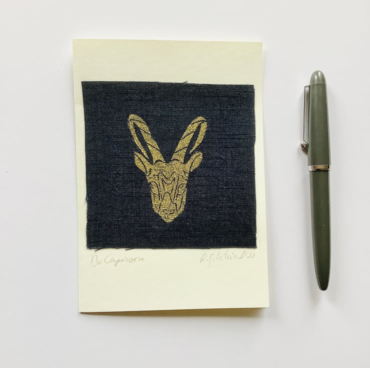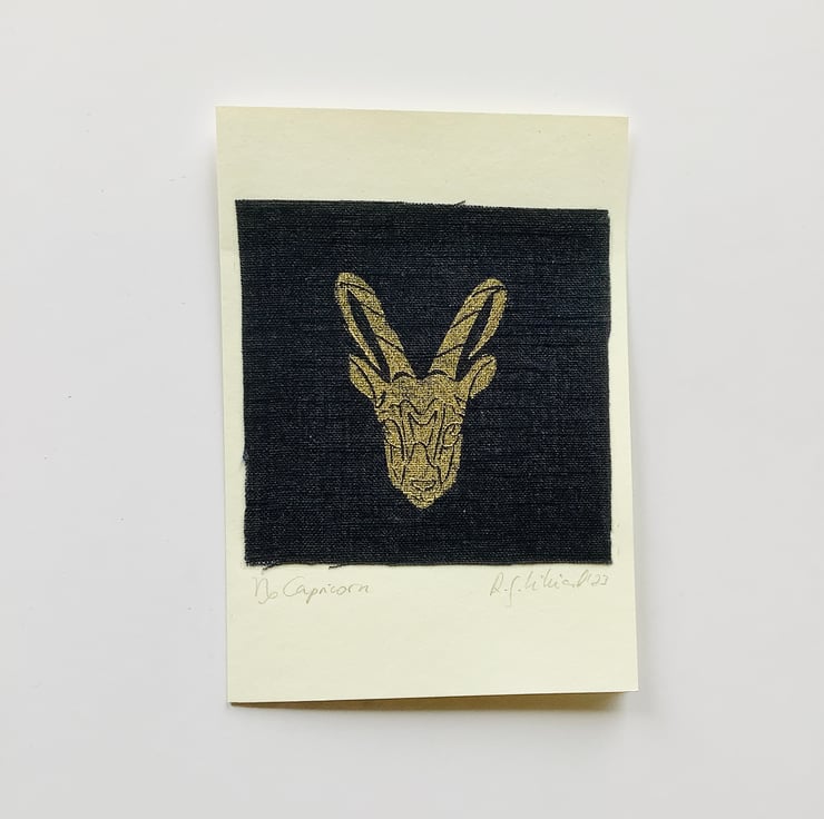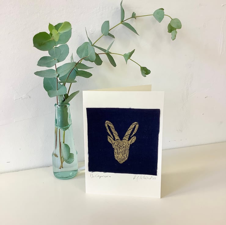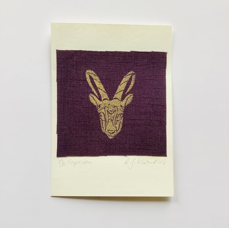 Zodiac design greeting cards featuring original lino block print, hand drawn and hand carved into lino block and then hand printed on natural Eco-friendly 100% linen. The print on the linen fabric is then placed onto 100% recycled acid free card.