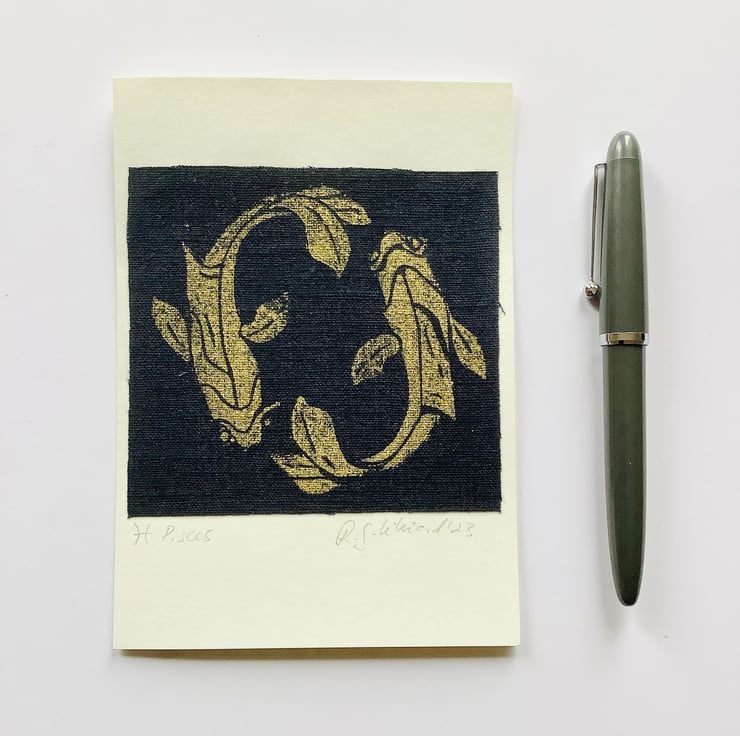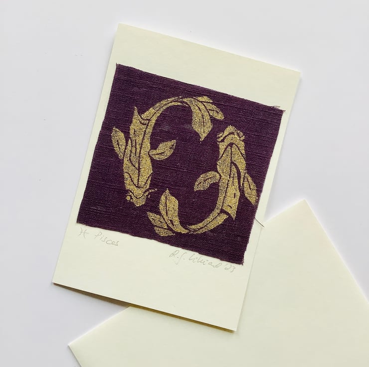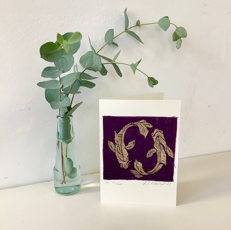 Zodiac design greeting cards featuring original lino block print, hand drawn and hand carved into lino block and then hand printed on natural Eco-friendly 100% linen. The print on the linen fabric is then placed onto 100% recycled acid free card.