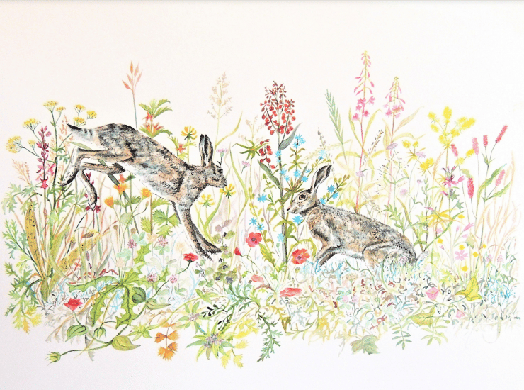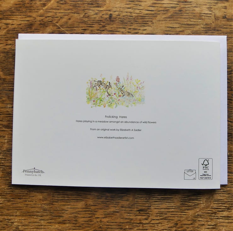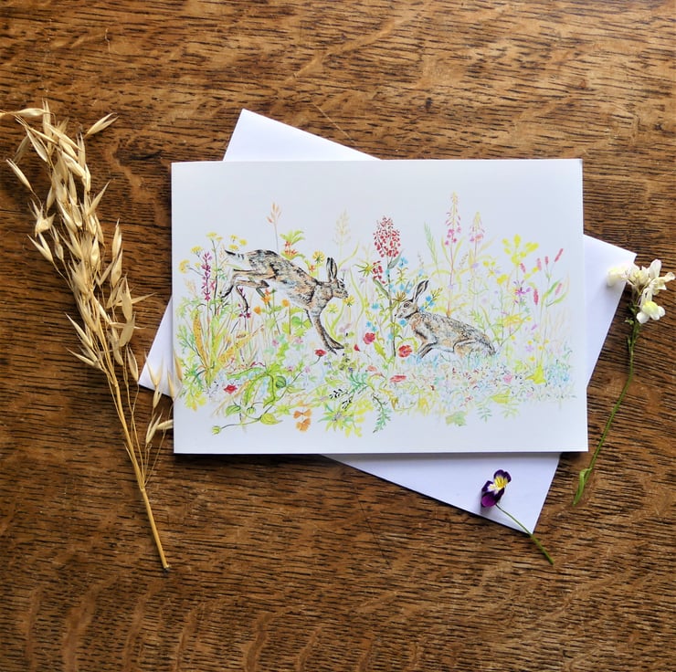 A5 Landscape blank fine art greeting card 148.5 x 210mm printed on FSC semi-gloss paper produced from an image taken from my original watercolour and ink of boxing hares amongst meadow flowers.