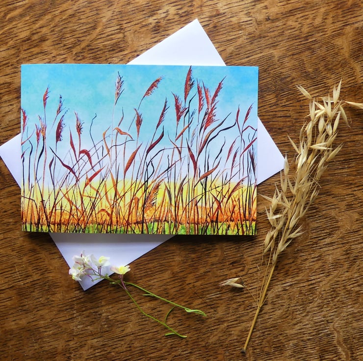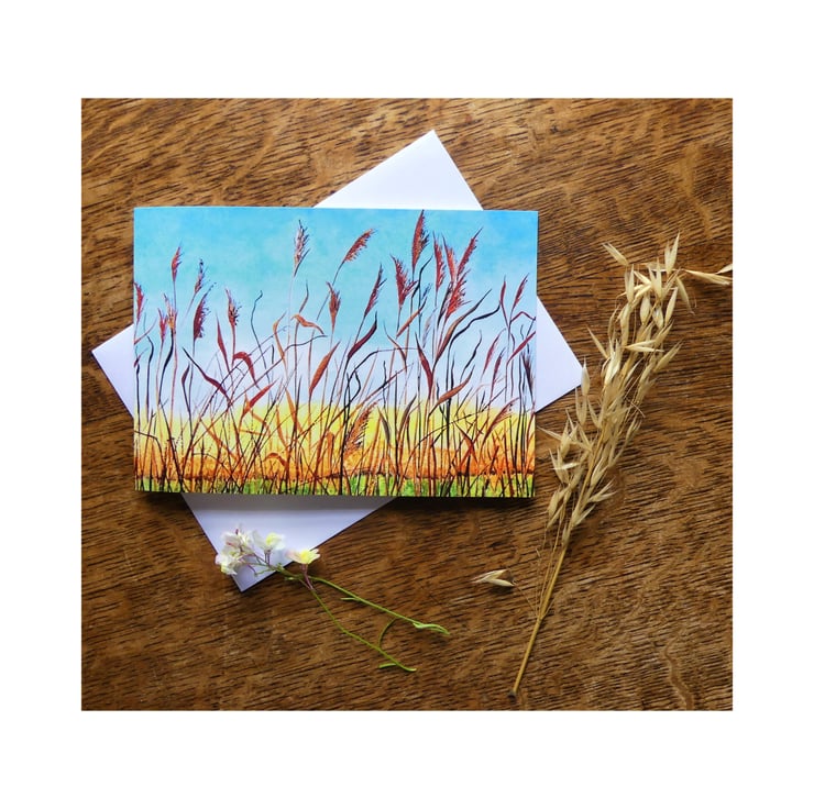 Summer Fen Reeds Field Landscape Greeting Card from Original Watercolour