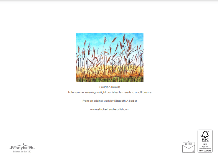 A5 Landscape blank fine art greeting card 148.5 x 210mm printed on FSC semi-gloss paper produced from an image taken from my original watercolour painting of a sunrise over reeds in the Fens.
