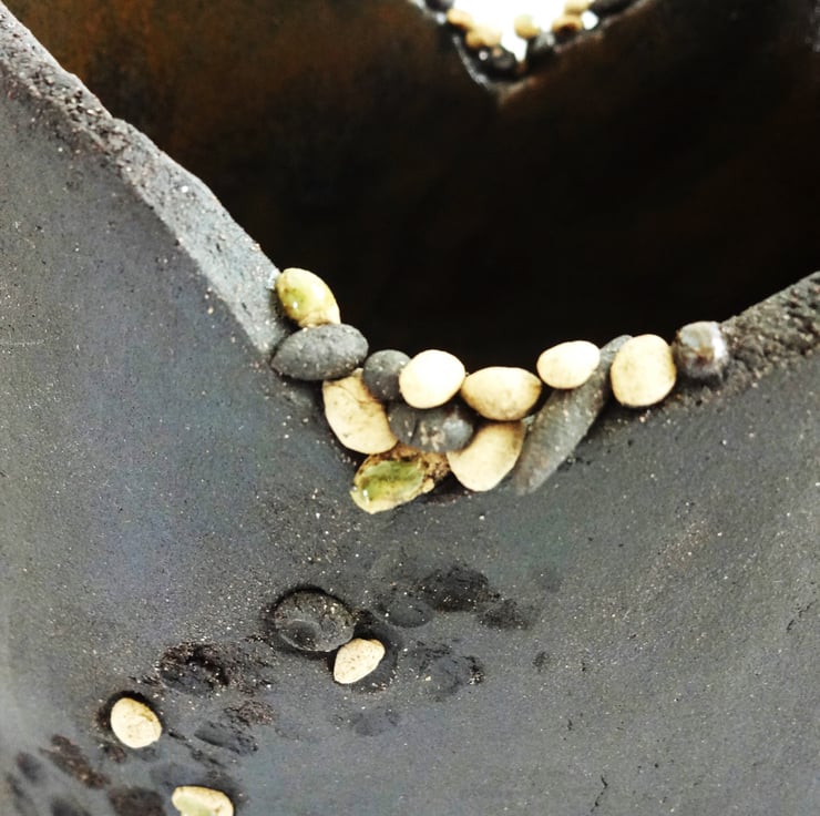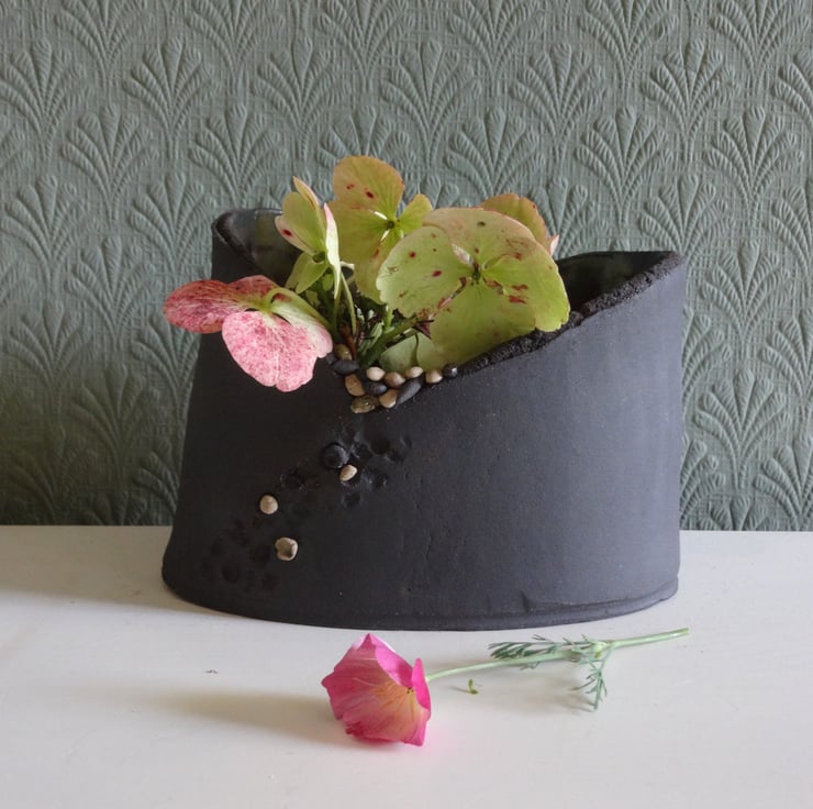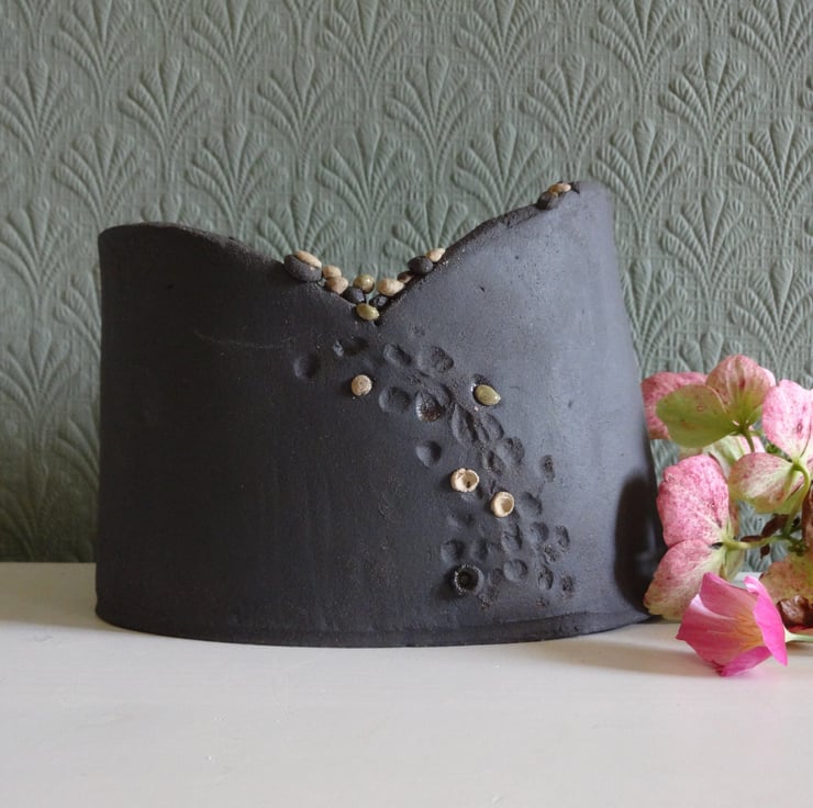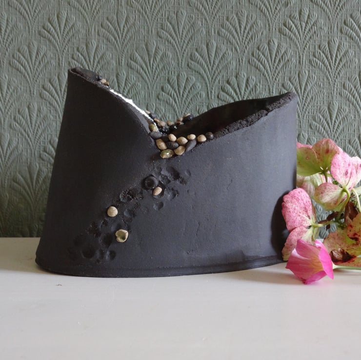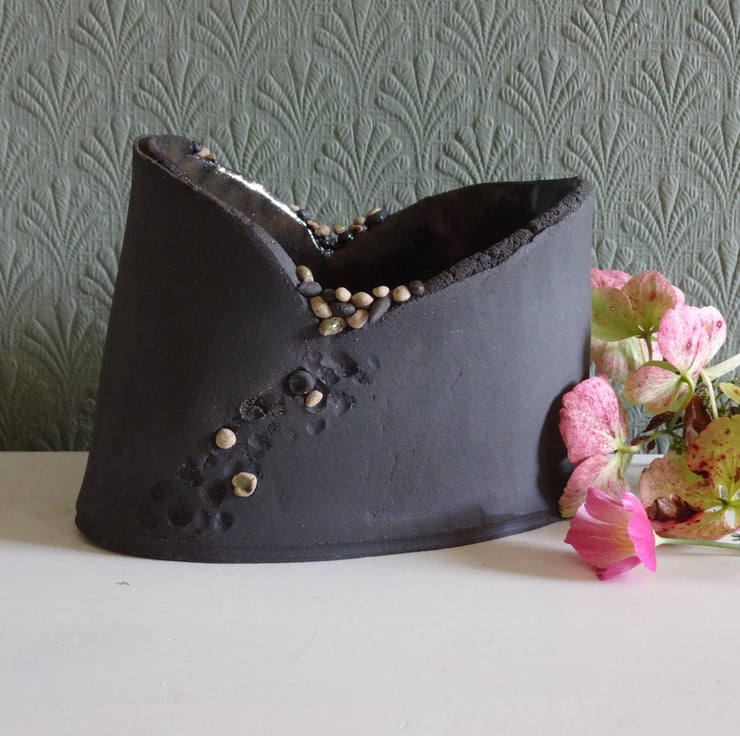 Inspired by the way tiny pebbles wedge themselves into rocks and driftwood, I made this piece from stoneware clay, to form a container, then handmade each tiny pebble shape from a mixture of black and white clay and decorated the form with them. I introduced further seashore texture into the surface, and glazed the inside with a speckled lustre finish so that you can use the piece as a vase for dried flowers. Or to fill with your favourite shells and little driftwood forms. You will see from the images that the design is finished differently on each side, so choose which way you like it to face! With the natural matt finish of the fired black stoneware clay on the outside, shiny glaze inside and the decorative textures and tiny pebbles, this is a striking one-off piece for your own home or to give as a present for someone who loves the sea. Oval base, asymmetric shape, natural black clay exterior, 15 x 9 x 10cms high.